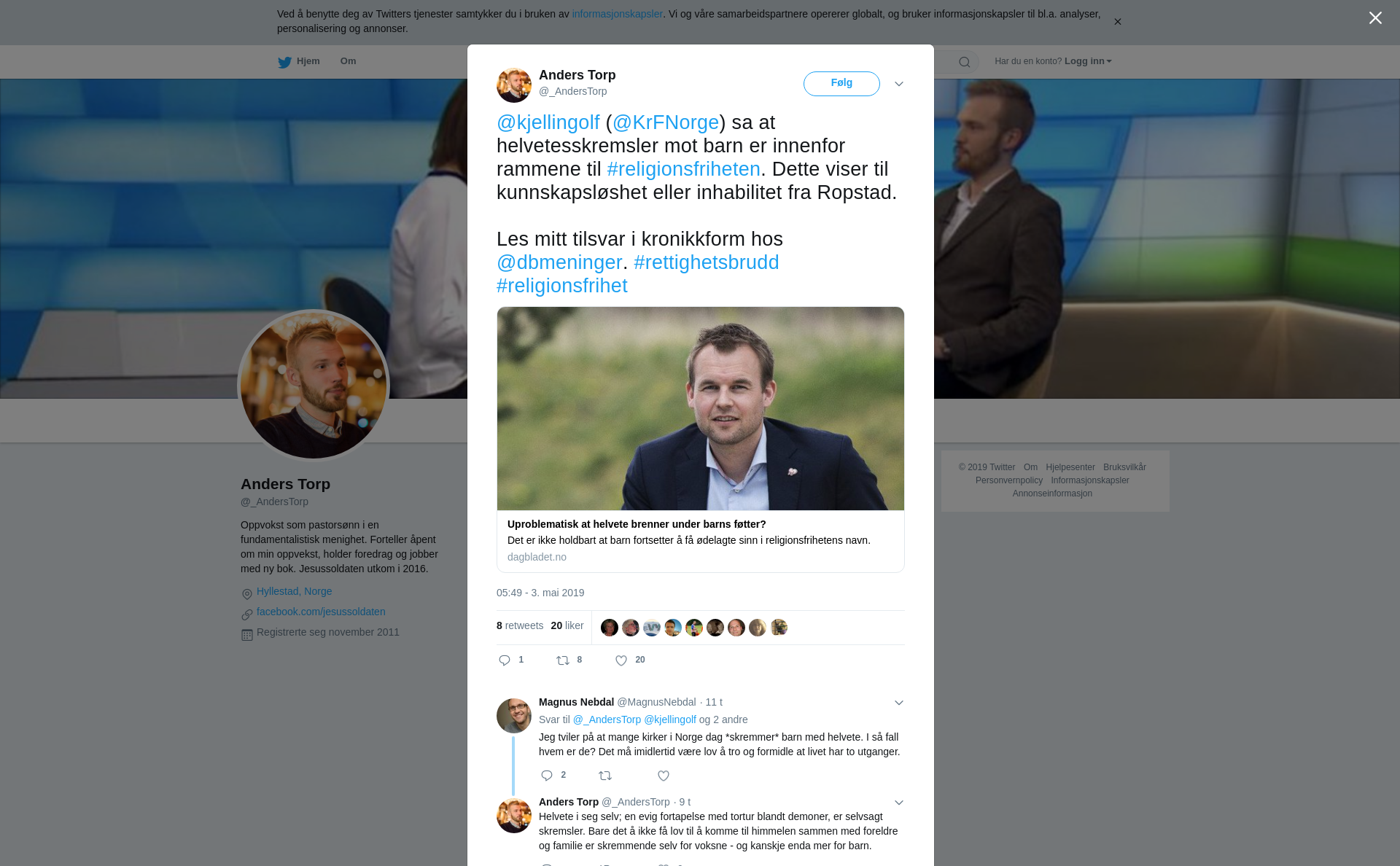 RT @_AndersTorp: @kjellingolf (@KrFNorge) sa at helvetesskremsler mot barn er innenfor rammene til #religionsfriheten. Dette viser til kunnskapsløshet eller inhabilitet fra Ropstad.