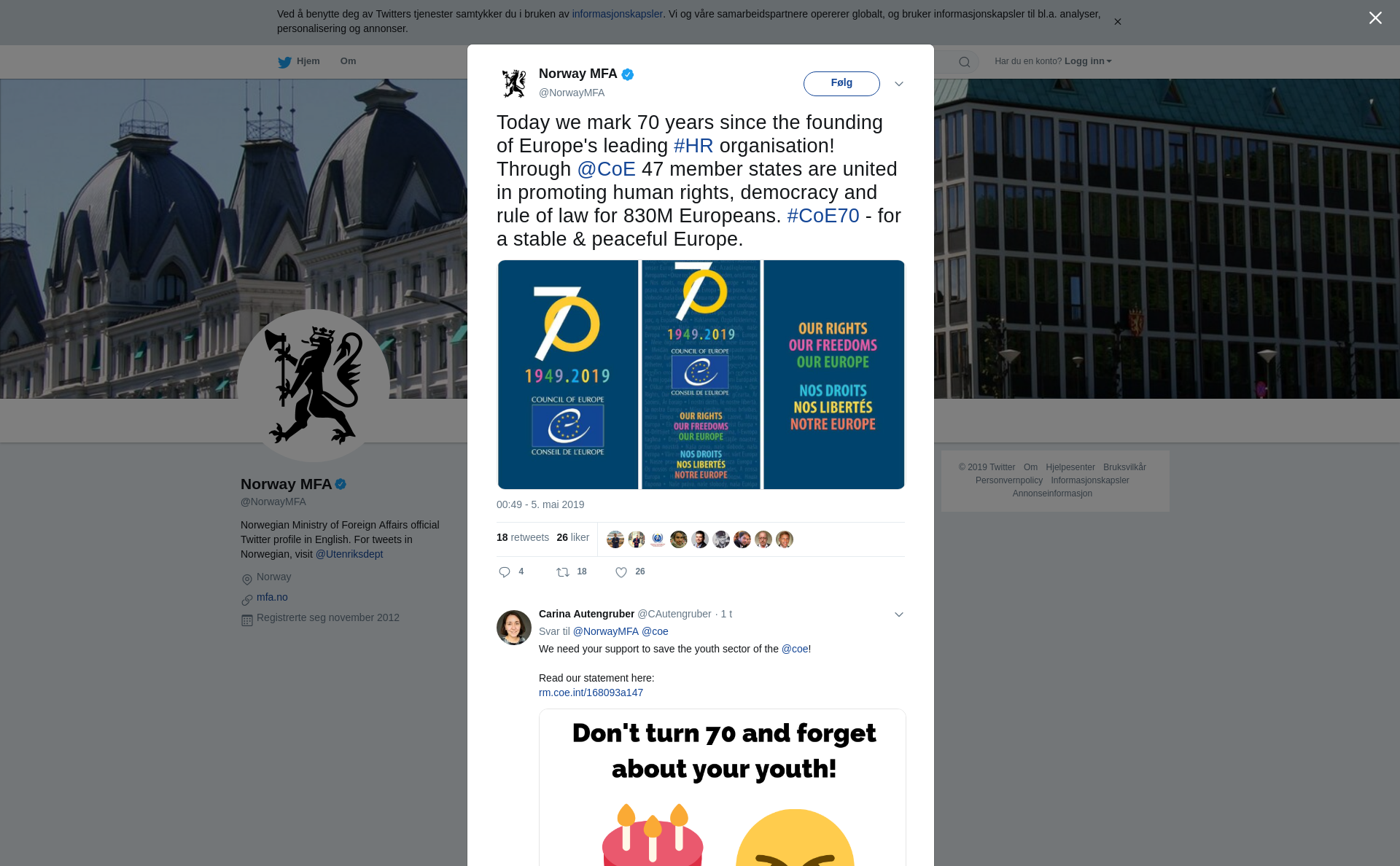 Today we mark 70 years since the founding of Europe's leading #HR organisation! Through @CoE 47 member states are united in promoting human rights, democracy and rule of law for 830M Europeans. #CoE70 - for a stable & peaceful Europe. https://t.co/J0rhtfkszc