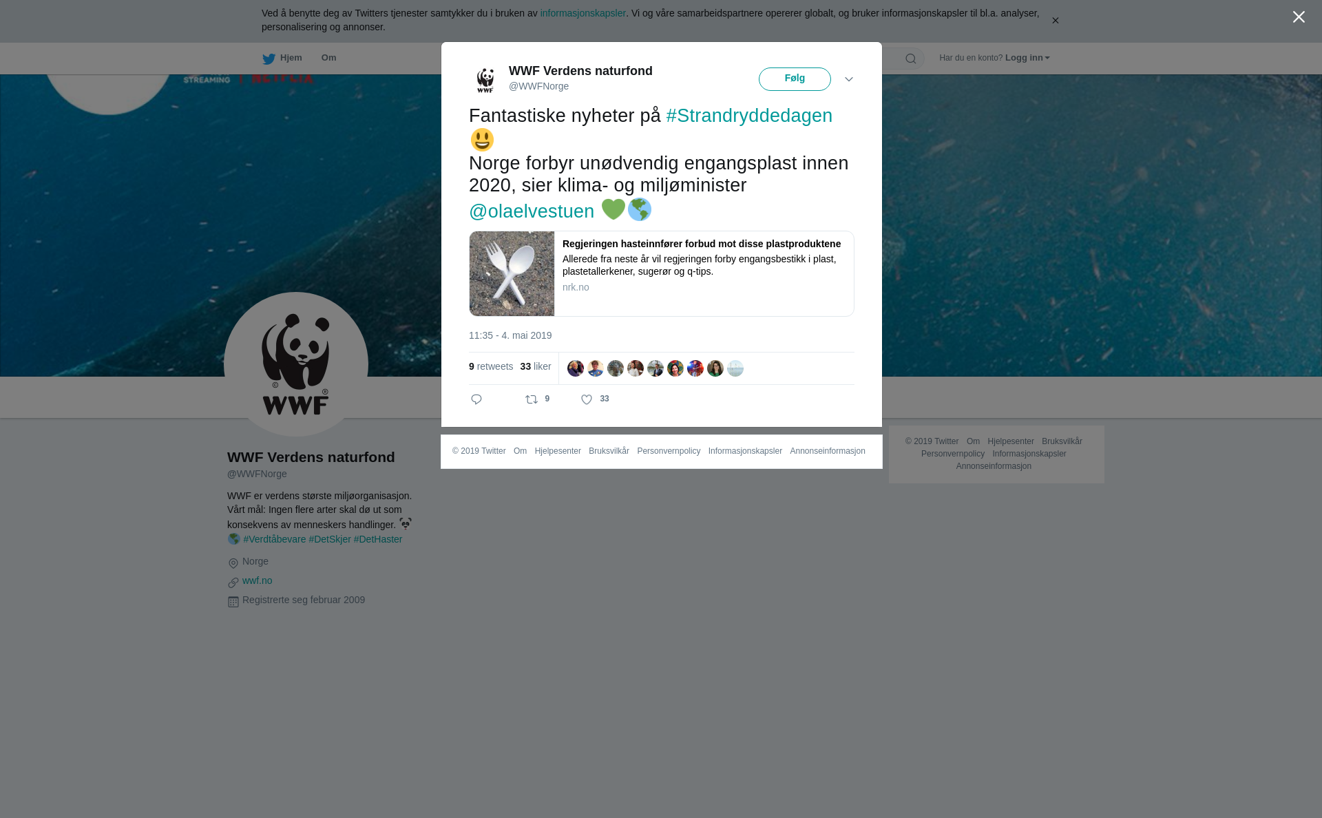 RT @WWFNorge: Fantastiske nyheter på #Strandryddedagen 😃 Norge forbyr unødvendig engangsplast innen 2020, sier klima- og miljøminister @ola…