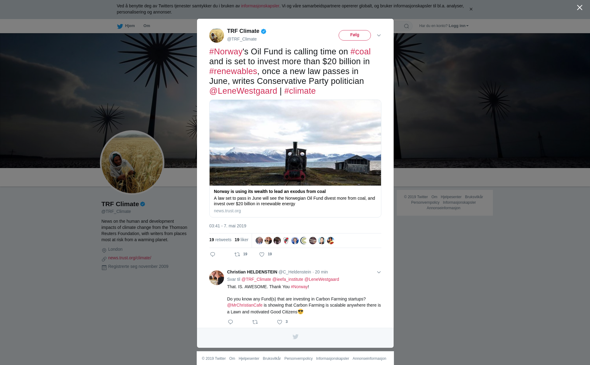 RT @TRF_Climate: #Norway's Oil Fund is calling time on #coal and is set to invest more than $20 billion in #renewables, once a new law passes in June, writes Conservative Party politician @LeneWestgaard | #climate https://t.co/mNpdKvflwa