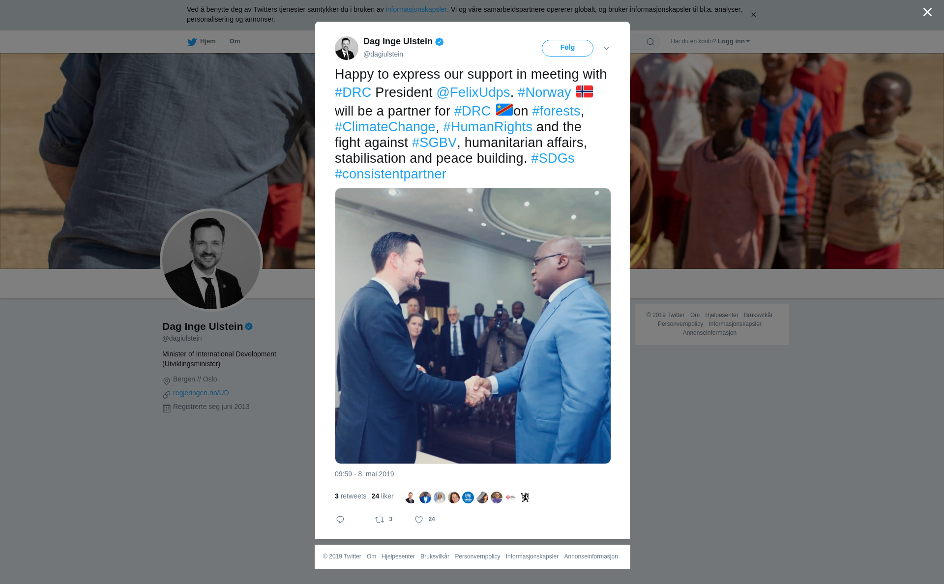 RT @dagiulstein: Happy to express our support in meeting with #DRC President @FelixUdps. #Norway 🇳🇴will be a partner for #DRC 🇨🇩on #forests, #ClimateChange, #HumanRights and the fight against #SGBV, humanitarian affairs, stabilisation and peace building. #SDGs #consistentpartner https://t.co/OqweJKGDQX