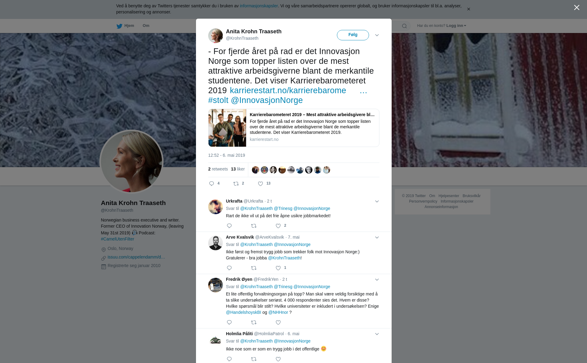 RT @KrohnTraaseth: - For fjerde året på rad er det Innovasjon Norge som topper listen over de mest attraktive arbeidsgiverne blant de merkantile studentene. Det viser Karrierebarometeret 2019 https://t.co/HkcgqXK3a6 #stolt @InnovasjonNorge