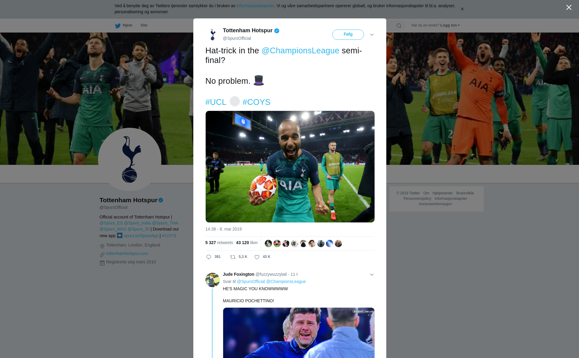 RT @SpursOfficial: Hat-trick in the @ChampionsLeague semi-final? No problem. 🎩 #UCL ⚪️ #COYS https://t.co/2I2rbWtGUf