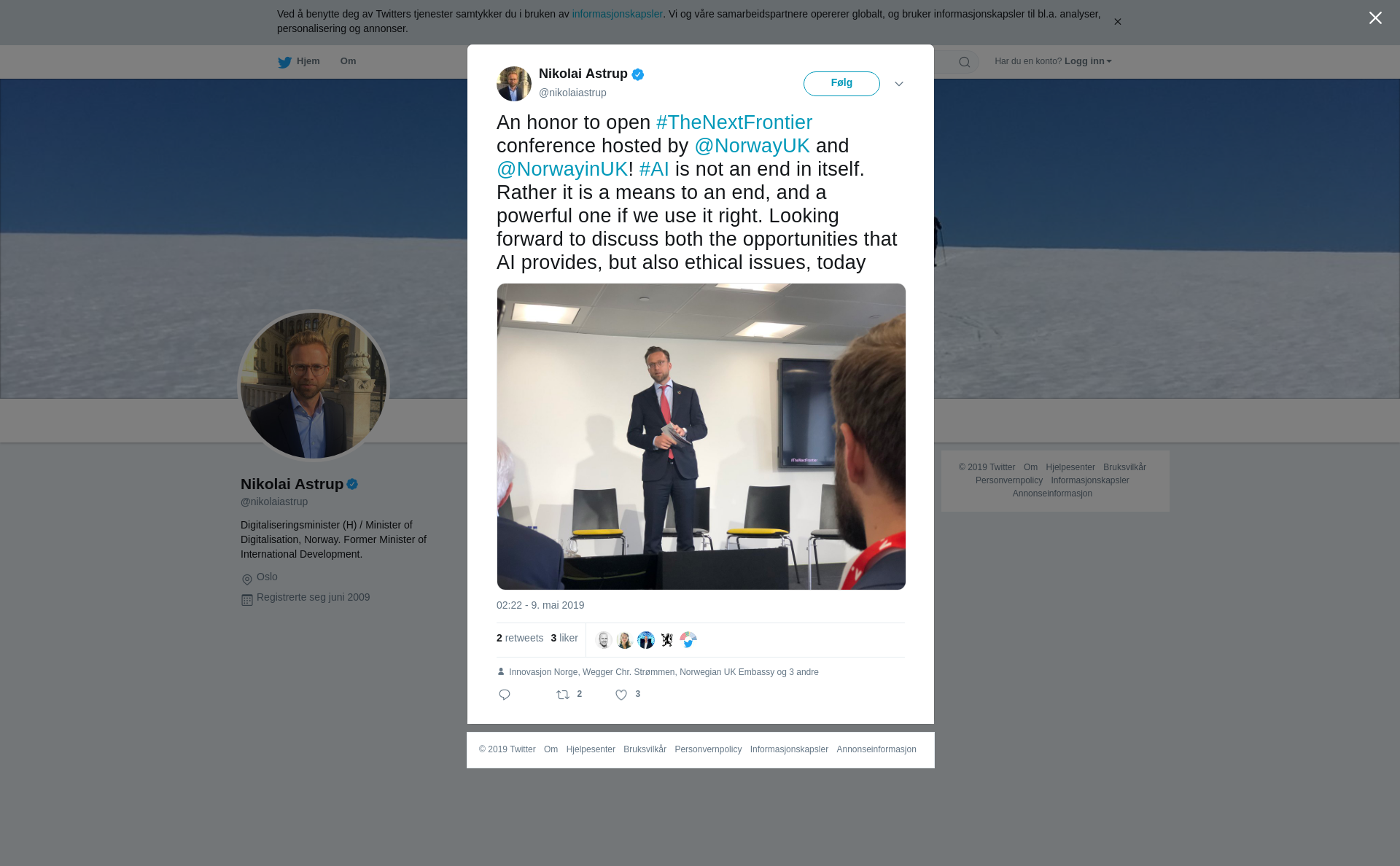 RT @nikolaiastrup: An honor to open #TheNextFrontier conference hosted by @NorwayUK and @NorwayinUK! #AI is not an end in itself. Rather it is a means to an end, and a powerful one if we use it right. Looking forward to discuss both the opportunities that AI provides, but also ethical issues, today https://t.co/bb0ihGCZlz