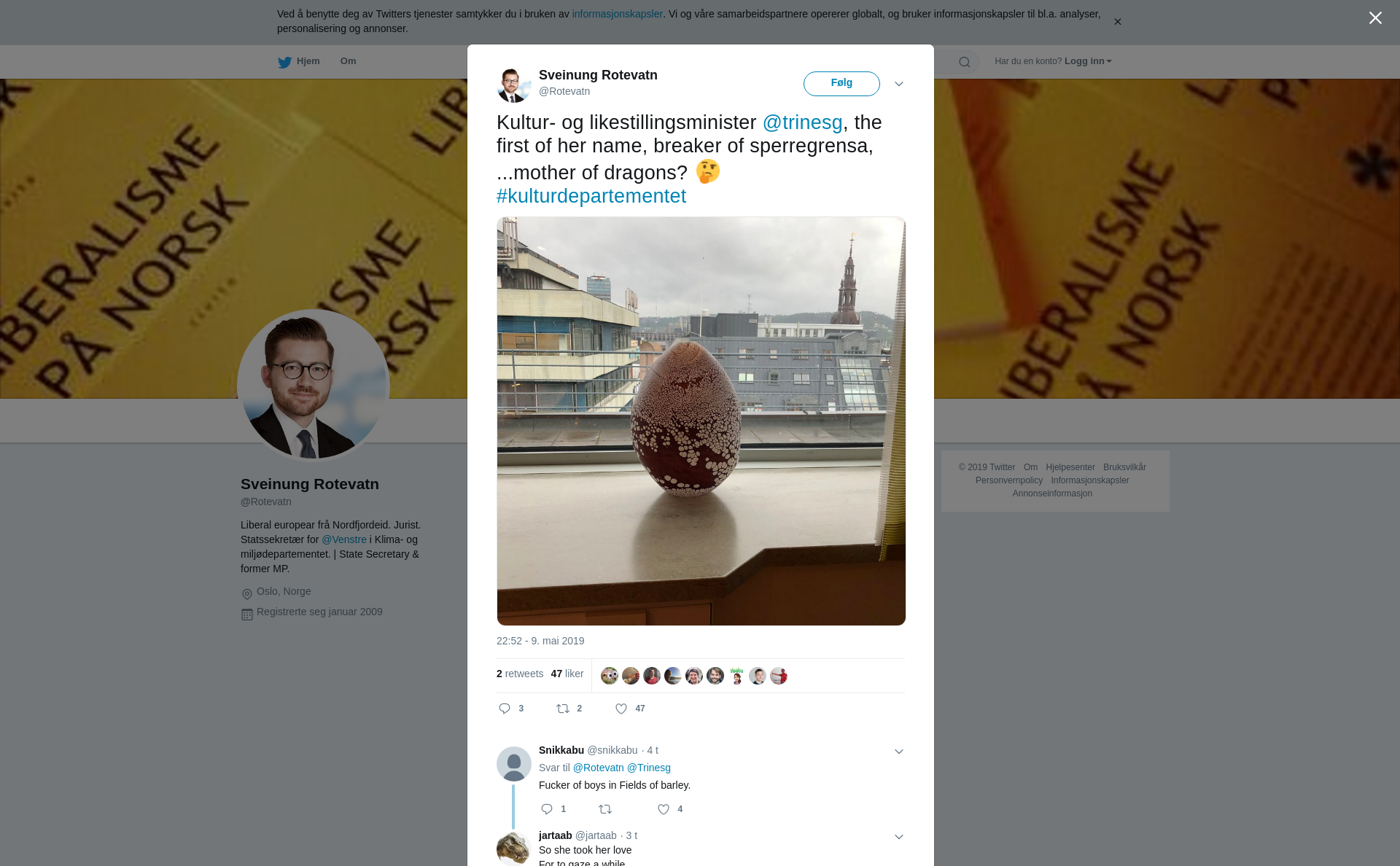 RT @Rotevatn: Kultur- og likestillingsminister @trinesg, the first of her name, breaker of sperregrensa, ...mother of dragons? 🤔 #kulturdepartementet https://t.co/fSYlrrsJDk