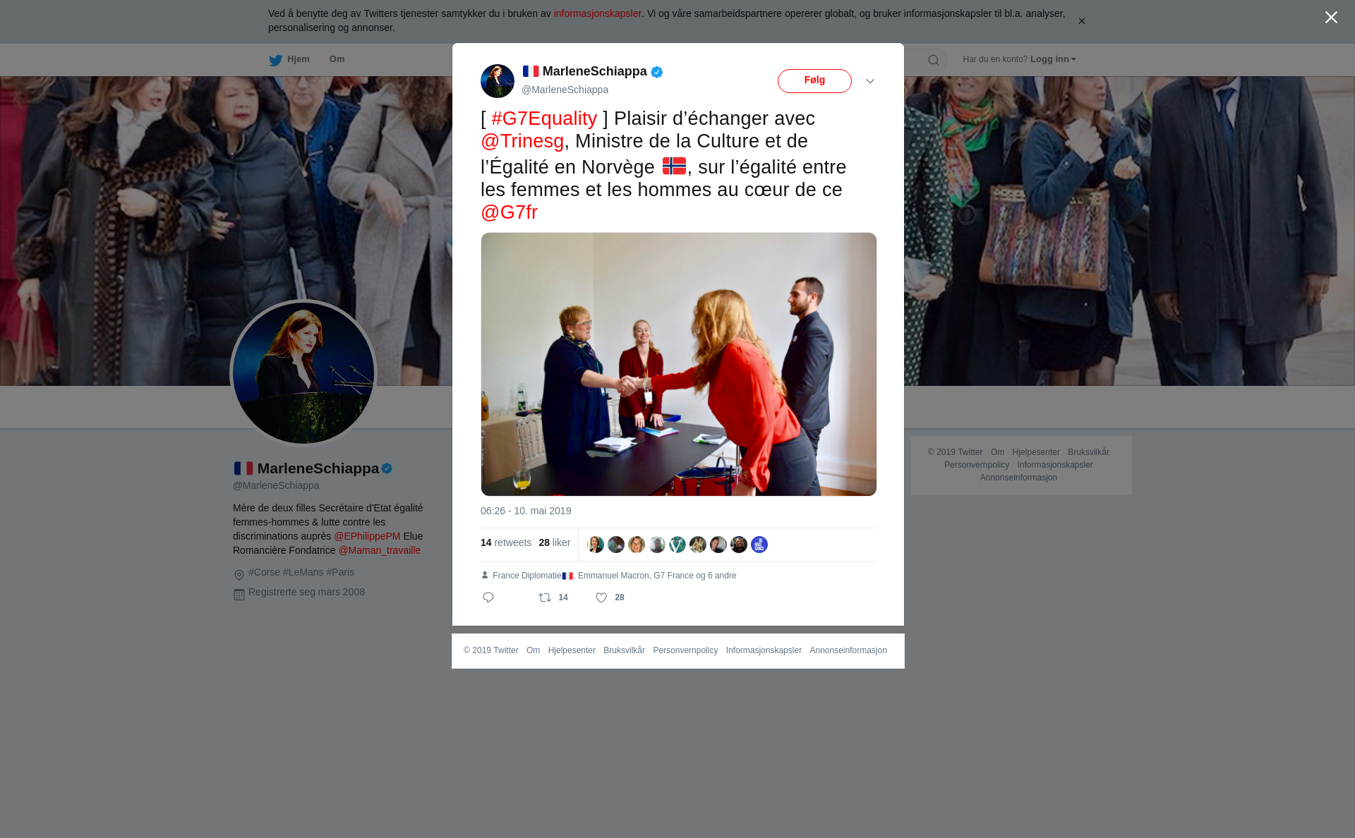 RT @MarleneSchiappa: [ #G7Equality ] Plaisir d’échanger avec @Trinesg, Ministre de la Culture et de l’Égalité en Norvège 🇳🇴, sur l’égalité entre les femmes et les hommes au cœur de ce @G7fr https://t.co/2hkBpPxbtZ