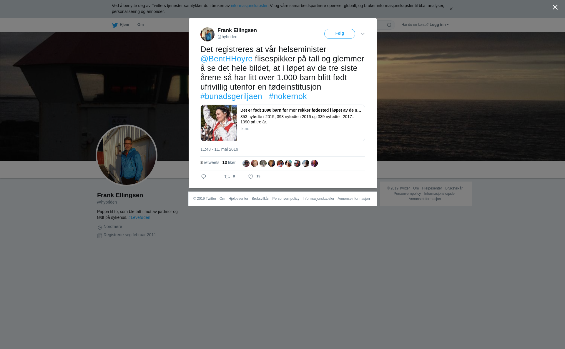 RT @hybriden: Det registreres at vår helseminister @BentHHoyre flisespikker på tall og glemmer å se det hele bildet, at i løpet av de tre siste årene så har litt over 1.000 barn blitt født ufrivillig utenfor en fødeinstitusjon #bunadsgeriljaen #nokernok https://t.co/o0s85ltddq