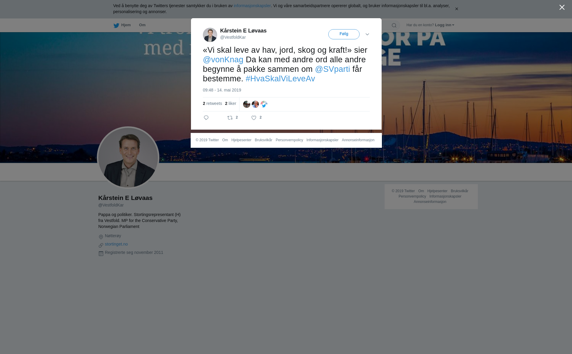 «Vi skal leve av hav, jord, skog og kraft!» sier @vonKnag Da kan med andre ord alle andre begynne å pakke sammen om @SVparti får bestemme. #HvaSkalViLeveAv