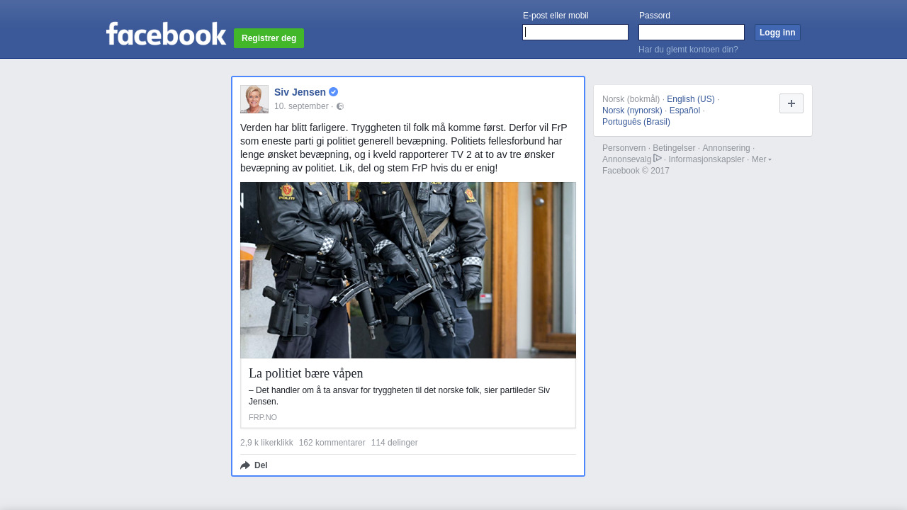 Verden har blitt farligere. Tryggheten til folk må komme først. Derfor vil FrP som eneste parti gi politiet generell bevæpning. Politiets fellesforbund har lenge ønsket bevæpning, og i kveld rapporterer TV 2 at to av tre ønsker bevæpning av politiet. Lik, del og stem FrP hvis du er enig!