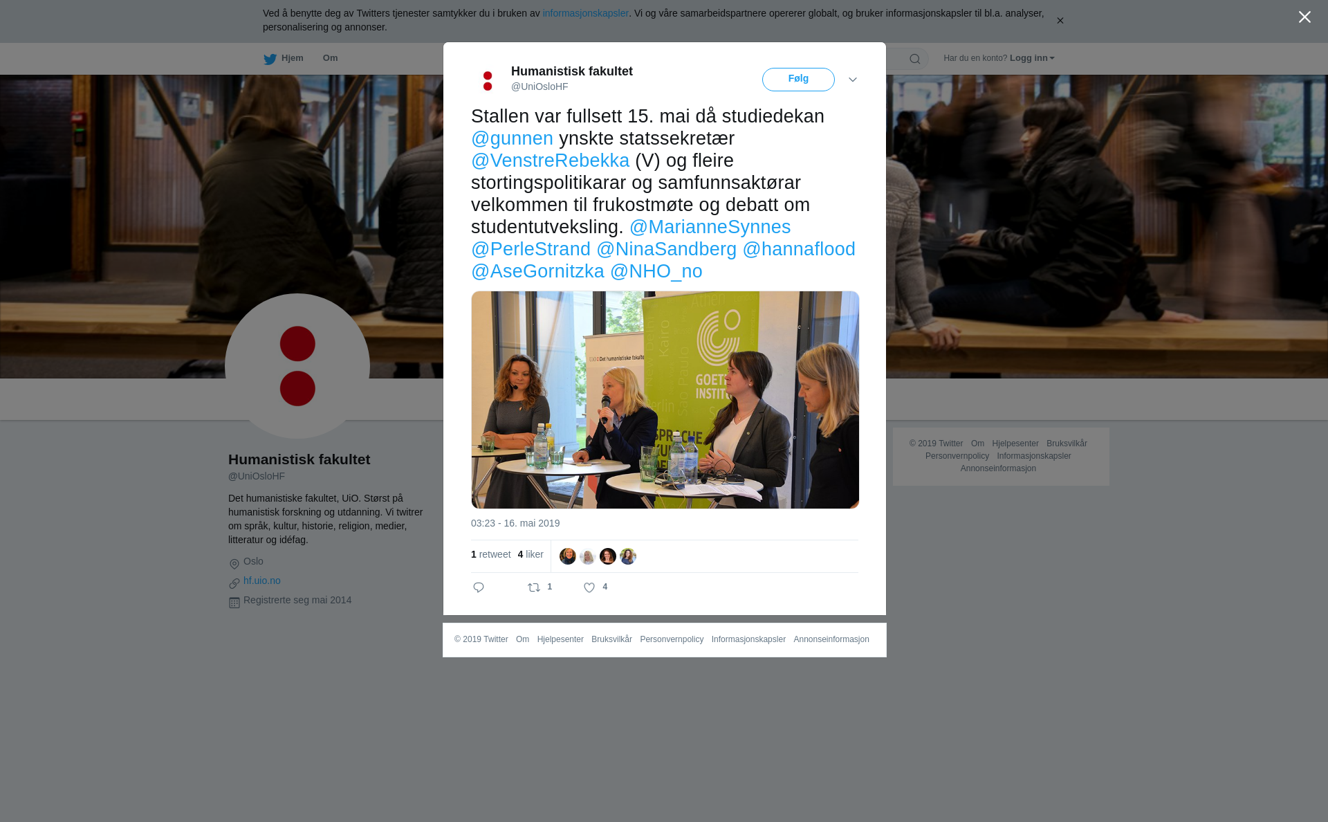 RT @UniOsloHF: Stallen var fullsett 15. mai då studiedekan @gunnen ynskte statssekretær @VenstreRebekka (V) og fleire stortingspolitikarar og samfunnsaktørar velkommen til frukostmøte og debatt om studentutveksling. @MarianneSynnes @PerleStrand @NinaSandberg @hannaflood @AseGornitzka @NHO_no https://t.co/YpdHv6VI49