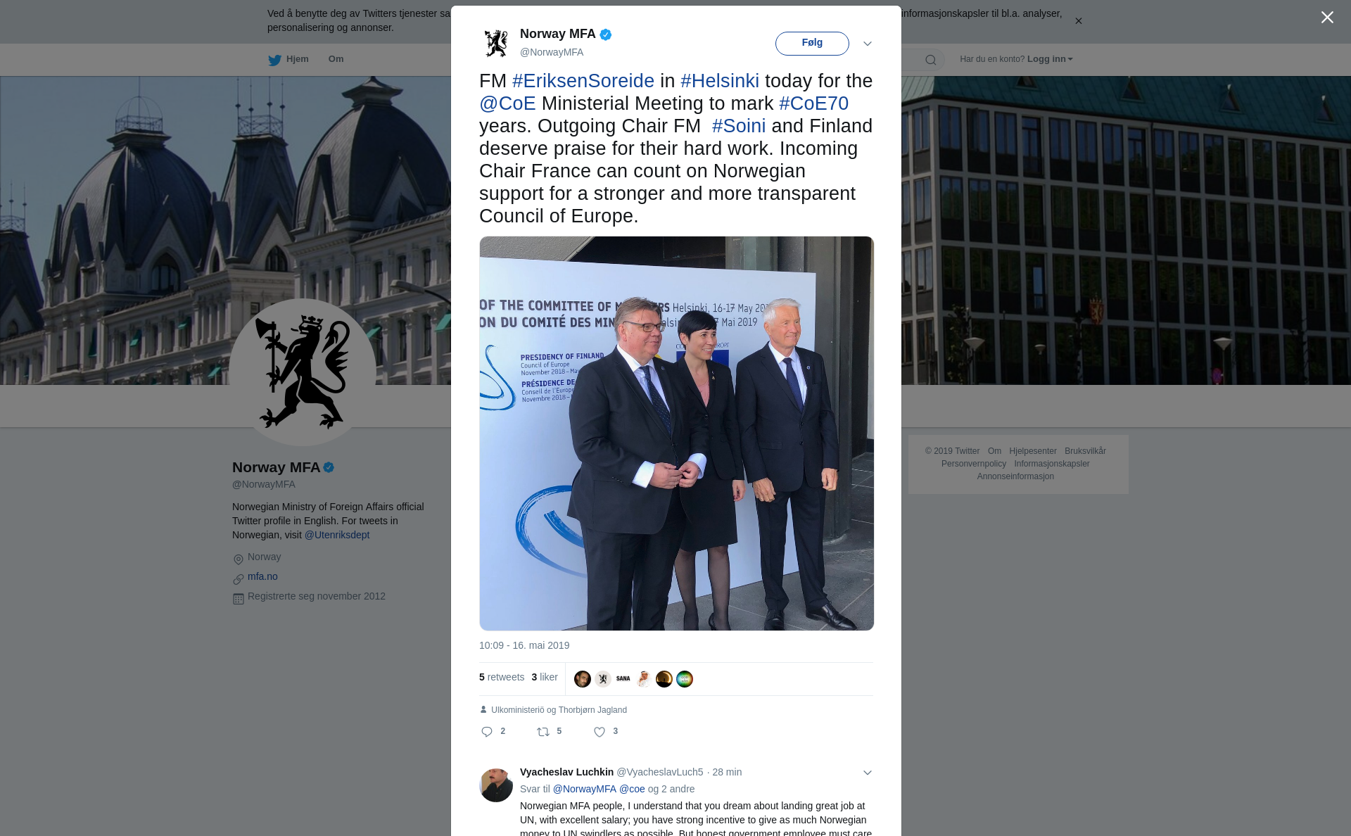 FM #EriksenSoreide in #Helsinki today for the @CoE Ministerial Meeting to mark #CoE70 years. Outgoing Chair FM #Soini and Finland deserve praise for their hard work. Incoming Chair France can count on Norwegian support for a stronger and more transparent Council of Europe. https://t.co/36AFYFK2Kw