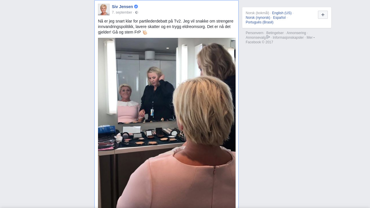 Nå er jeg snart klar for partilederdebatt på Tv2. Jeg vil snakke om strengere innvandringspolitikk, lavere skatter og en trygg eldreomsorg. Det er nå det gjelder! Gå og stem FrP 👏🏻