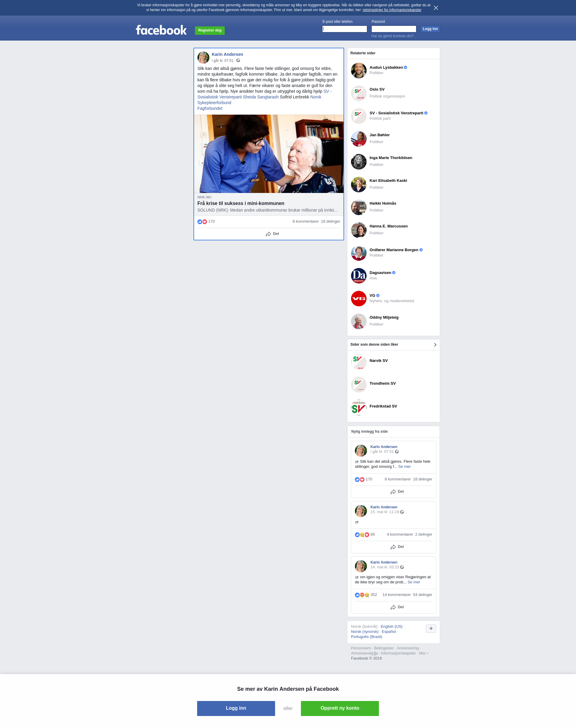 Slik kan det altså gjøres. Flere faste hele stillinger, god omsorg for eldre, mindre sjukefravær, fagfolk kommer tilbake. Ja det mangler fagfolk, men en kan få flere tilbake hvis en gjør det mulig for folk å gjøre jobben faglig godt og slippe å slite seg helt ut. Færre vikarer og faste ansatte er gull for den som må ha hjelp. Nye ansikter hver dag er utrygghet og dårlig hjelp SV - Sosialistisk Venstreparti Sheida Sangtarash Solfrid Lerbrekk Norsk Sykepleierforbund