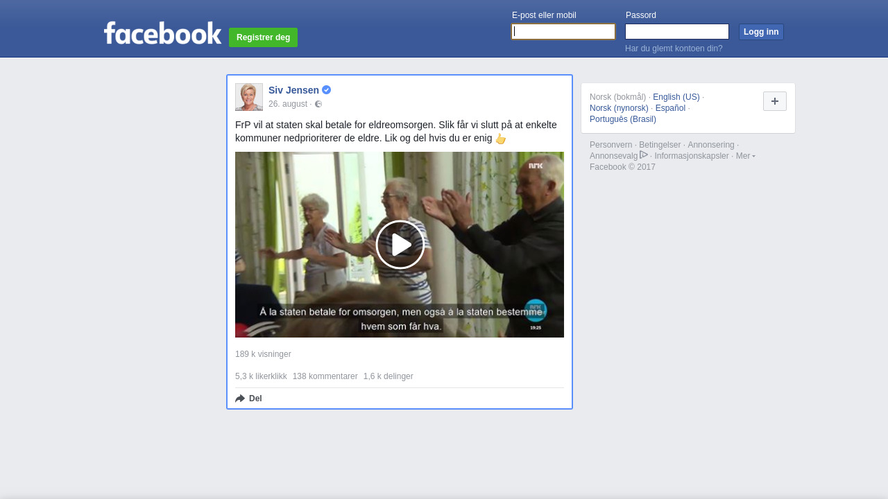 FrP vil at staten skal betale for eldreomsorgen. Slik får vi slutt på at enkelte kommuner nedprioriterer de eldre. Lik og del hvis du er enig 👍