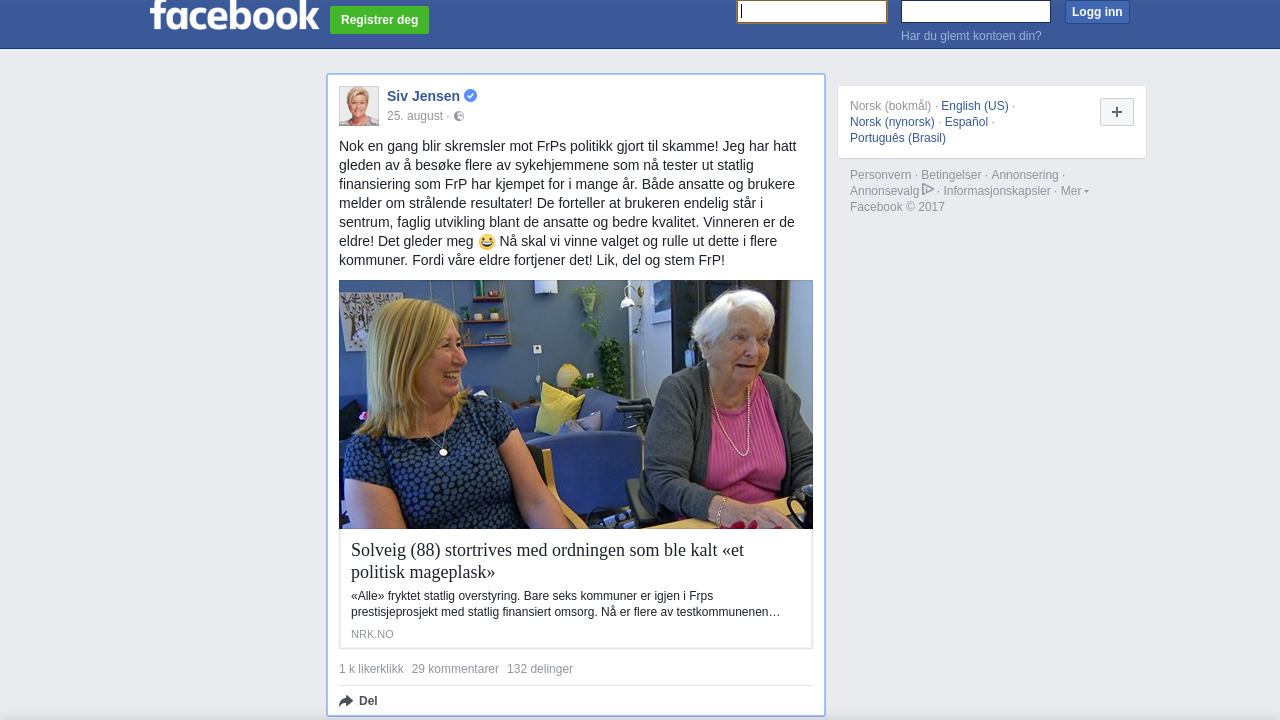 Nok en gang blir skremsler mot FrPs politikk gjort til skamme! Jeg har hatt gleden av å besøke flere av sykehjemmene som nå tester ut statlig finansiering som FrP har kjempet for i mange år. Både ansatte og brukere melder om strålende resultater! De forteller at brukeren endelig står i sentrum, faglig utvikling blant de ansatte og bedre kvalitet. Vinneren er de eldre! Det gleder meg 😀 Nå skal vi vinne valget og rulle ut dette i flere kommuner. Fordi våre eldre fortjener det! Lik og del 👍