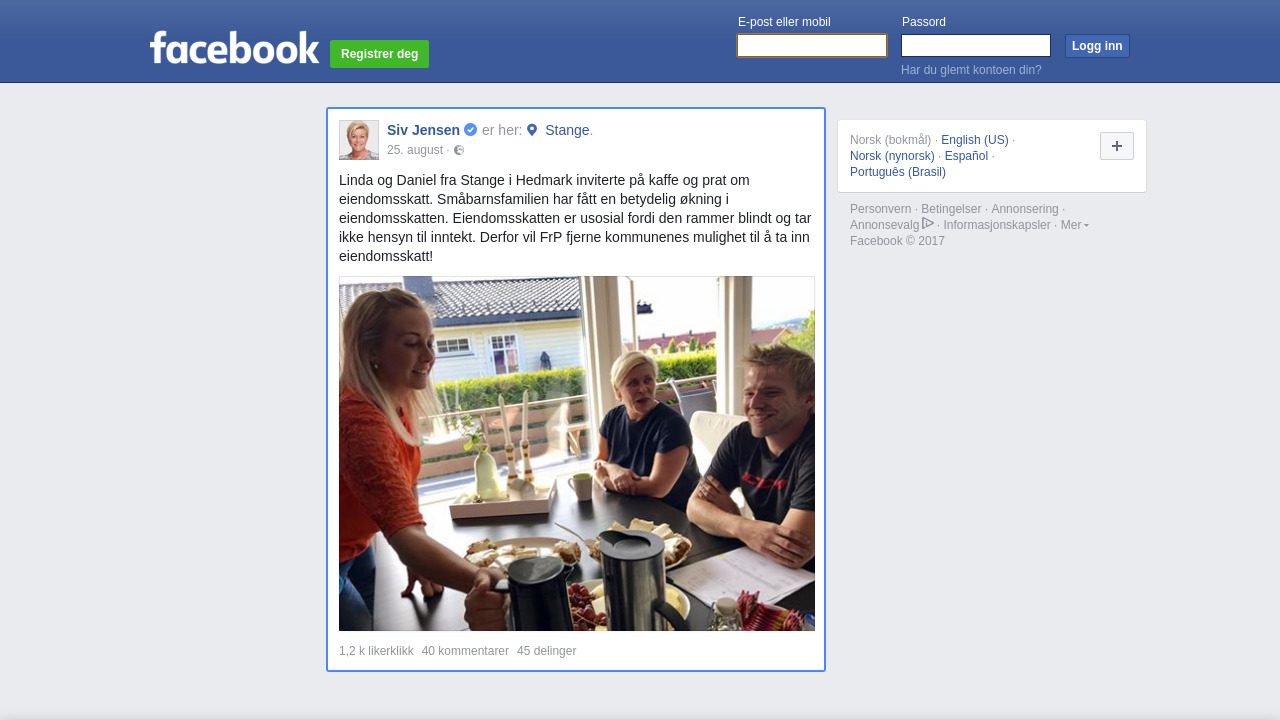 Linda og Daniel fra Stange i Hedmark inviterte på kaffe og prat om eiendomsskatt. Småbarnsfamilien har fått en betydelig økning i eiendomsskatten. Eiendomsskatten er usosial fordi den rammer blindt og tar ikke hensyn til inntekt. Derfor vil FrP fjerne kommunenes mulighet til å ta inn eiendomsskatt!