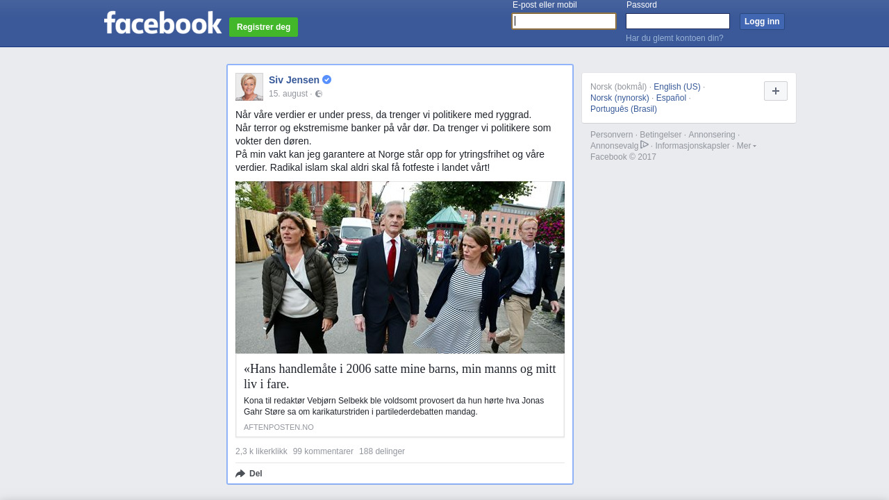 På min vakt kan jeg garantere at Norge står opp for ytringsfrihet og våre verdier. Radikal islam skal aldri skal få fotfeste i landet vårt!