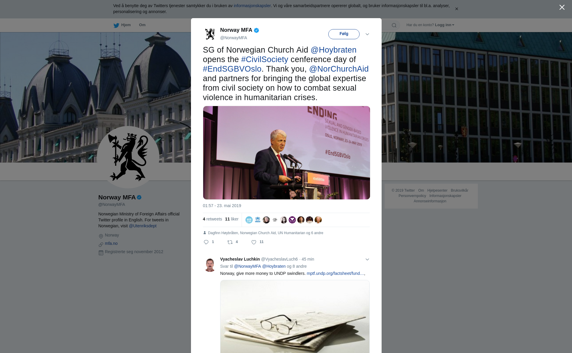 SG of Norwegian Church Aid @Hoybraten opens the #CivilSociety cenference day of #EndSGBVOslo. Thank you, @NorChurchAid and partners for bringing the global expertise from civil society on how to combat sexual violence in humanitarian crises. https://t.co/bsUciZfuvu
