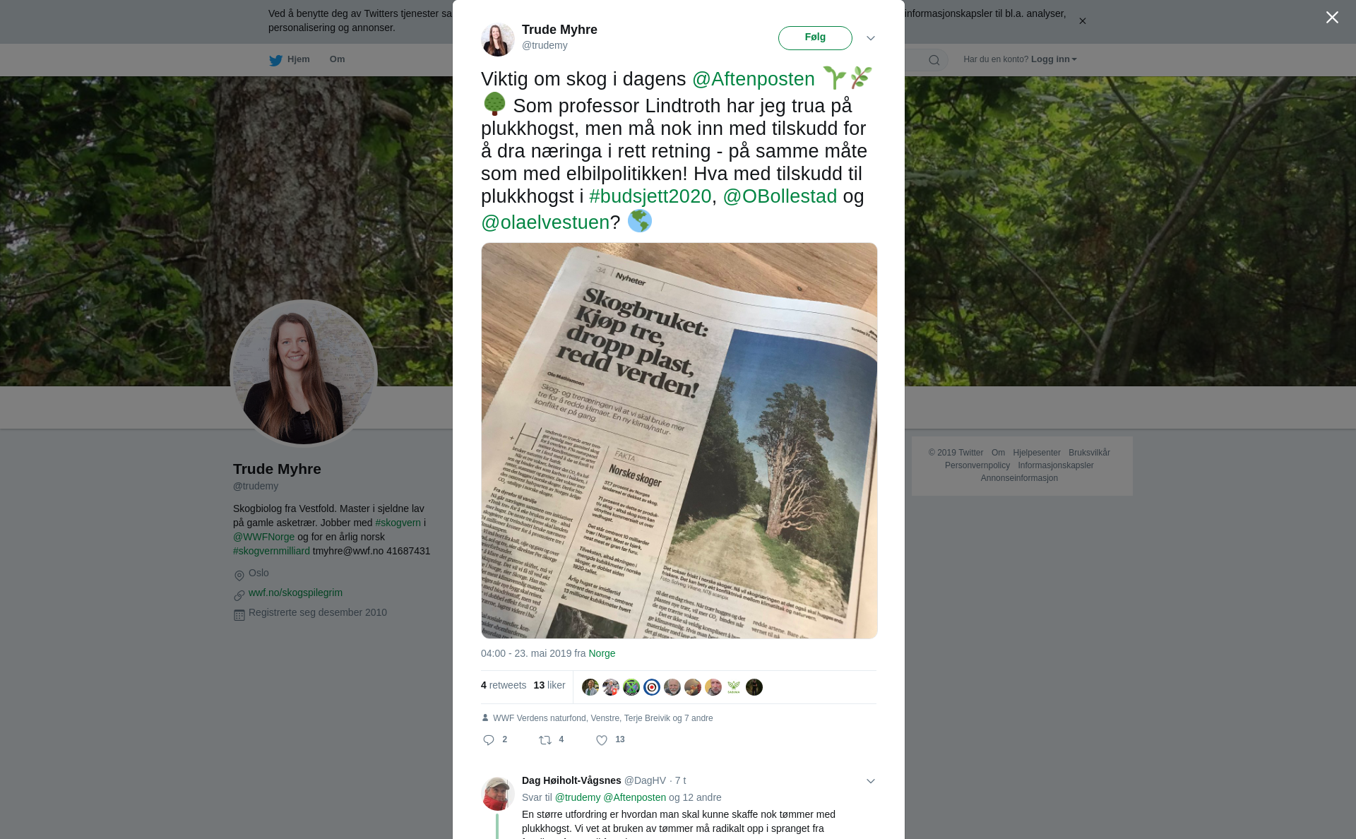 RT @trudemy: Viktig om skog i dagens @Aftenposten 🌱🌿🌳 Som professor Lindtroth har jeg trua på plukkhogst, men må nok inn med tilskudd for å dra næringa i rett retning - på samme måte som med elbilpolitikken! Hva med tilskudd til plukkhogst i #budsjett2020, @OBollestad og @olaelvestuen? 🌎 https://t.co/r3qWRgrWMj