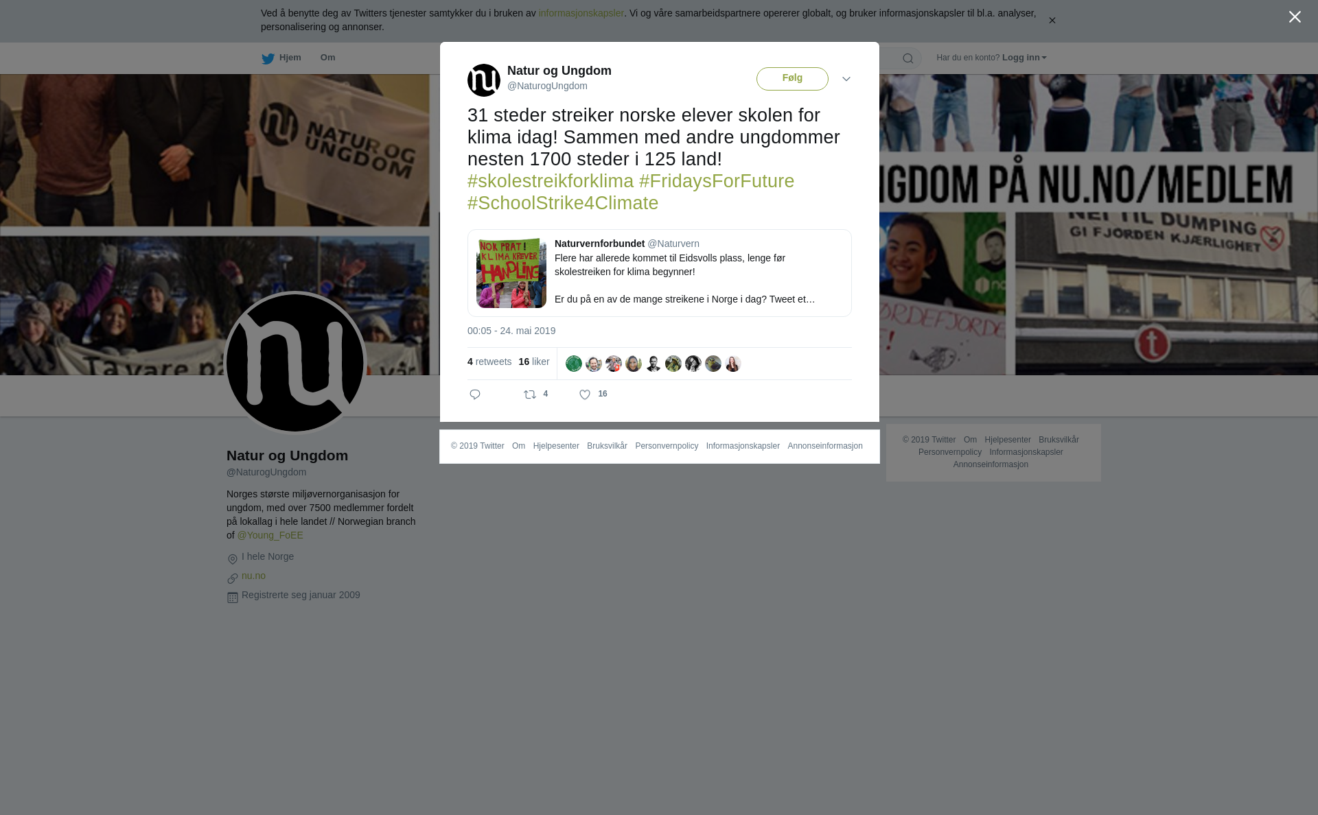 RT @NaturogUngdom: 31 steder streiker norske elever skolen for klima idag! Sammen med andre ungdommer nesten 1700 steder i 125 land! #skolestreikforklima #FridaysForFuture #SchoolStrike4Climate https://t.co/UWJ91iQN8X