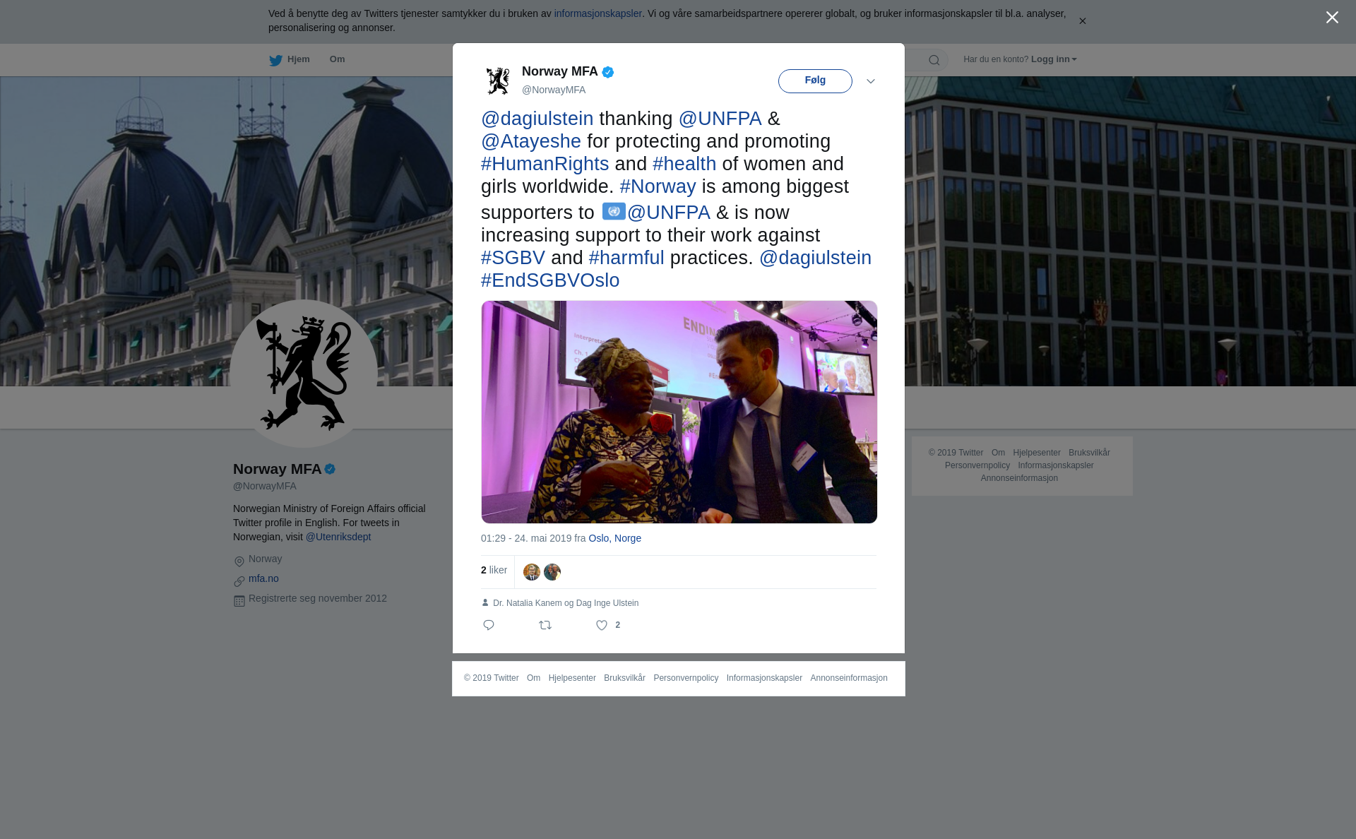 @dagiulstein thanking @UNFPA & @Atayeshe for protecting and promoting #HumanRights and #health of women and girls worldwide. #Norway is among biggest supporters to 🇺🇳@UNFPA & is now increasing support to their work against #SGBV and #harmful practices. @dagiulstein #EndSGBVOslo https://t.co/90Xh8grM2p