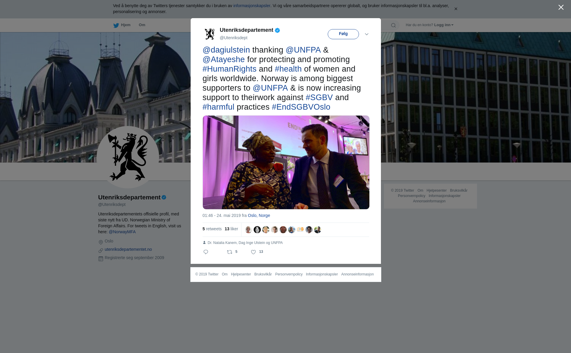 RT @Utenriksdept: @dagiulstein thanking @UNFPA & @Atayeshe for protecting and promoting #HumanRights and #health of women and girls worldwide. Norway is among biggest supporters to @UNFPA & is now increasing support to theirwork against #SGBV and #harmful practices #EndSGBVOslo https://t.co/ZF6cy8BfmD
