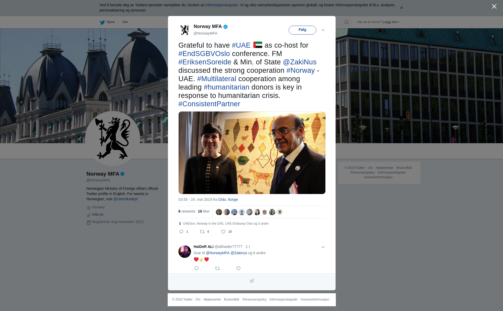 Grateful to have #UAE 🇦🇪 as co-host for #EndSGBVOslo conference. FM #EriksenSoreide & Min. of State @ZakiNus discussed the strong cooperation #Norway - UAE. #Multilateral cooperation among leading #humanitarian donors is key in response to humanitarian crisis. #ConsistentPartner https://t.co/ZfPyYngA8g