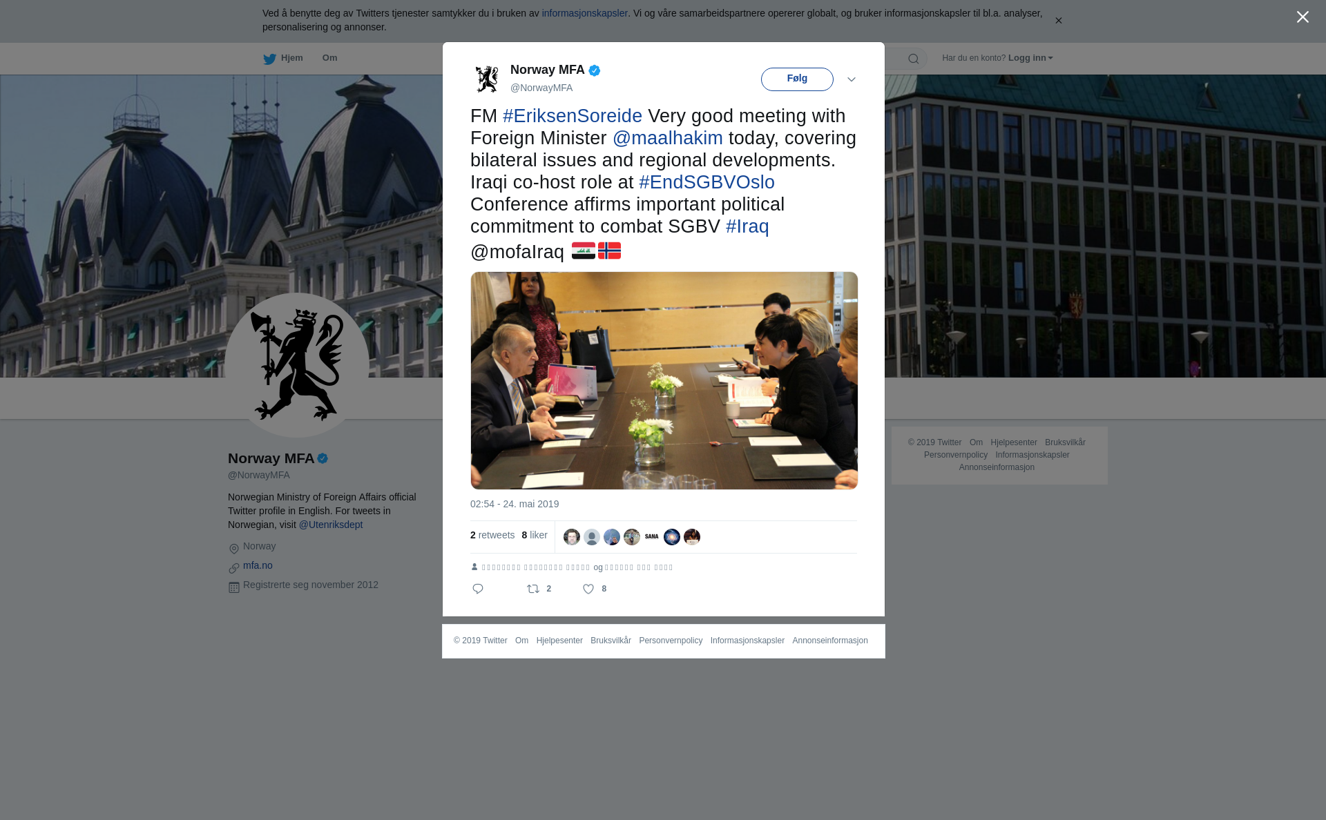 FM #EriksenSoreide Very good meeting with Foreign Minister @maalhakim today, covering bilateral issues and regional developments. Iraqi co-host role at #EndSGBVOslo Conference affirms important political commitment to combat SGBV #Iraq @mofaIraq 🇮🇶🇳🇴 https://t.co/f2EkbWOLnu