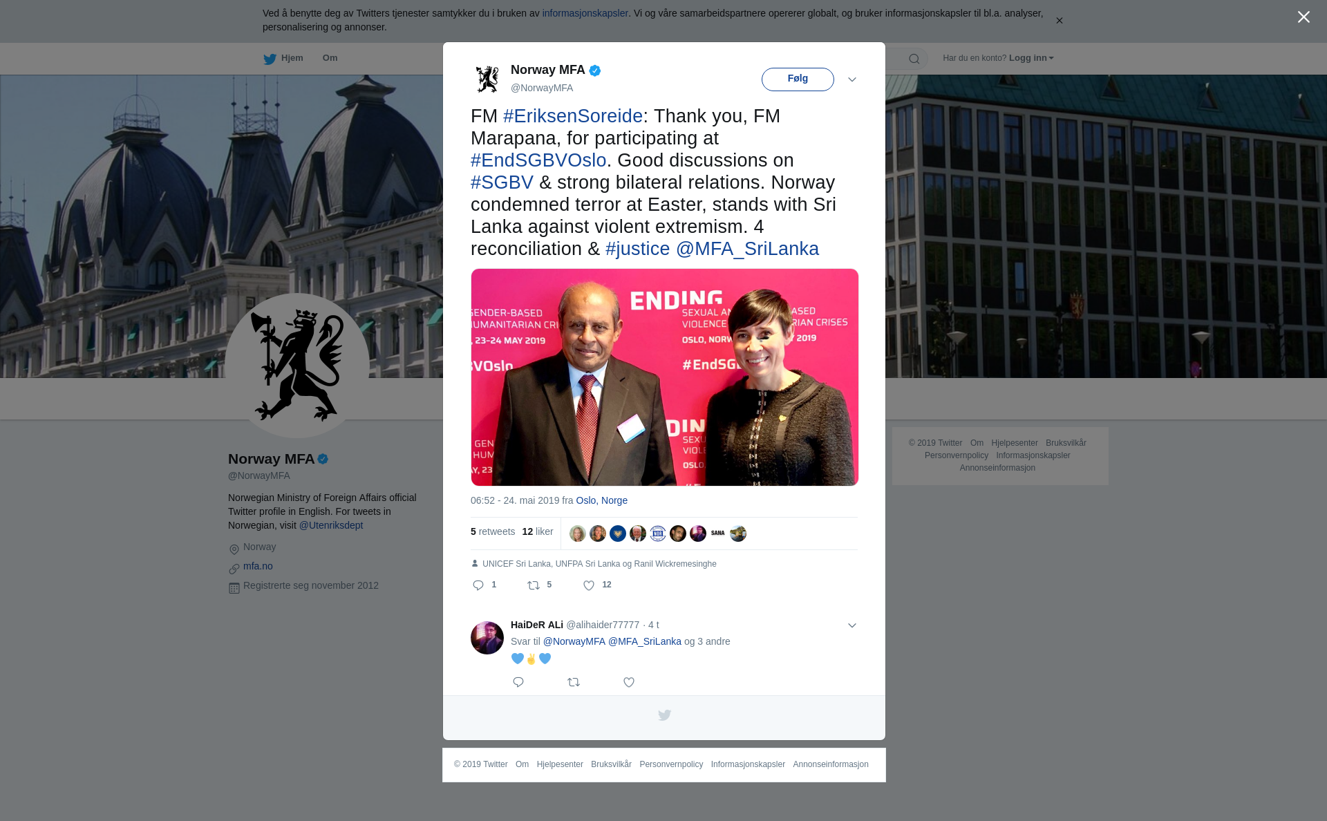 FM #EriksenSoreide: Thank you, FM Marapana, for participating at #EndSGBVOslo. Good discussions on #SGBV & strong bilateral relations. Norway condemned terror at Easter, stands with Sri Lanka against violent extremism. 4 reconciliation & #justice @MFA_SriLanka https://t.co/r8ja8yB8ca