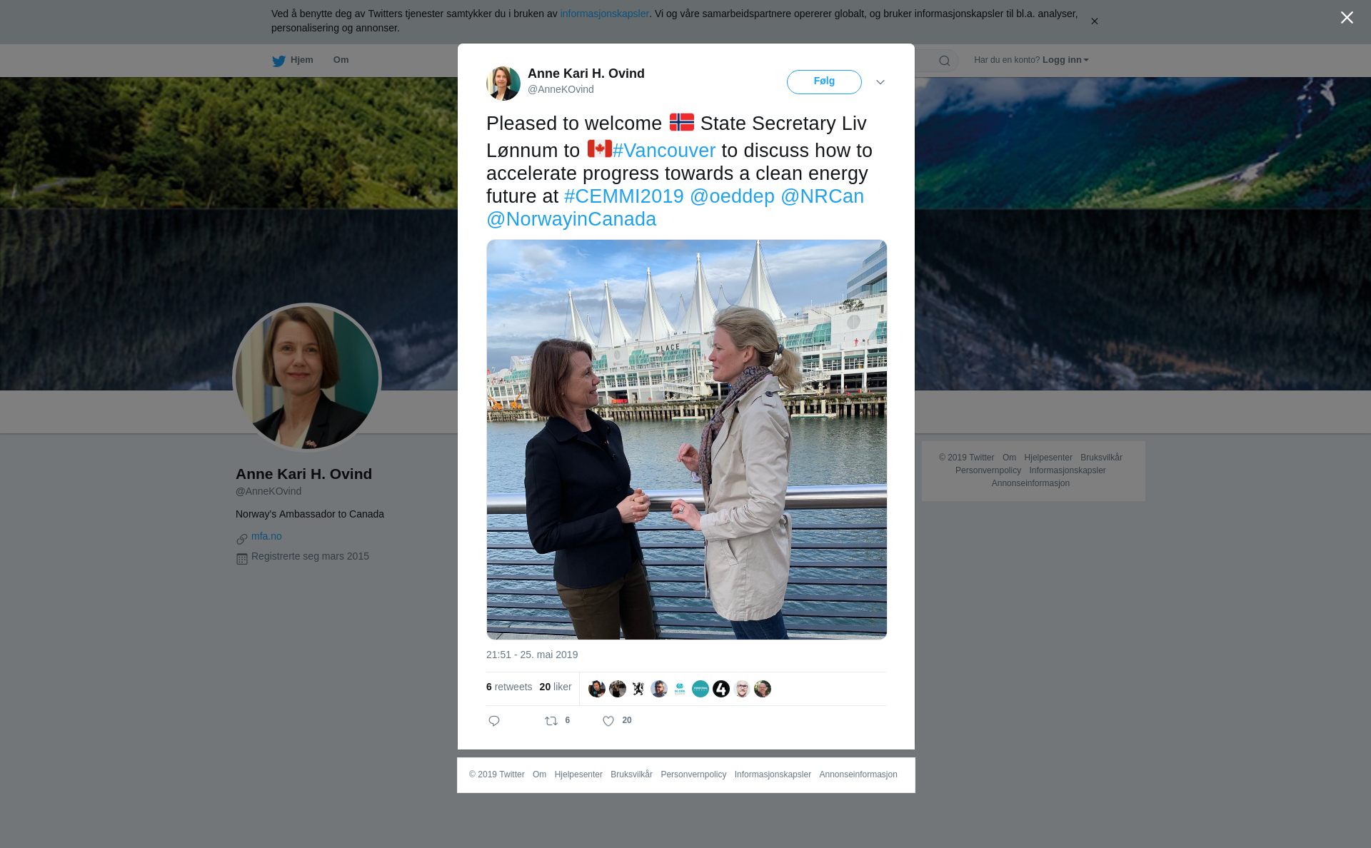 RT @AnneKOvind: Pleased to welcome 🇳🇴 State Secretary Liv Lønnum to 🇨🇦#Vancouver to discuss how to accelerate progress towards a clean energy future at #CEMMI2019 @oeddep @NRCan @NorwayinCanada https://t.co/T1o7XPlOhA