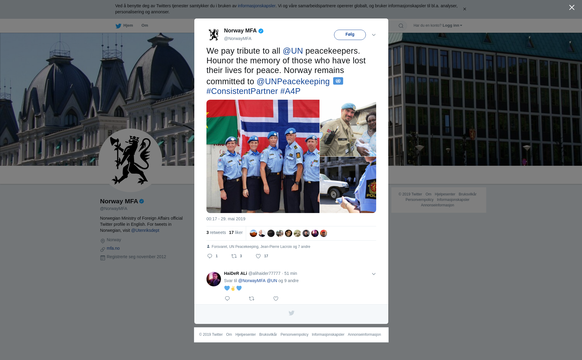 We pay tribute to all @UN peacekeepers. Hounor the memory of those who have lost their lives for peace. Norway remains committed to @UNPeacekeeping 🇺🇳#ConsistentPartner #A4P https://t.co/Aj1jZ94OsS