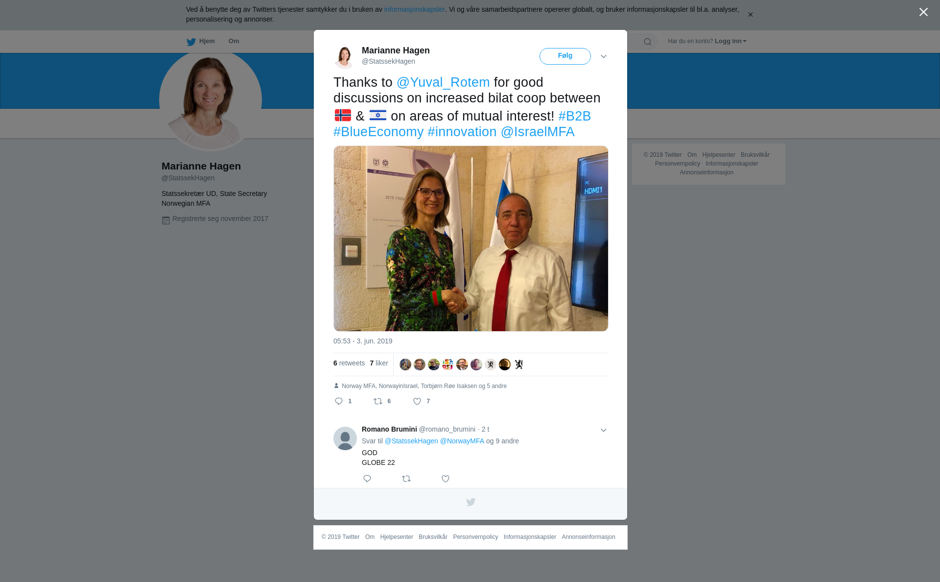 RT @StatssekHagen: Thanks to @Yuval_Rotem for good discussions on increased bilat coop between 🇳🇴 & 🇮🇱 on areas of mutual interest! #B2B #BlueEconomy #innovation @IsraelMFA https://t.co/TpBX3CPVxE