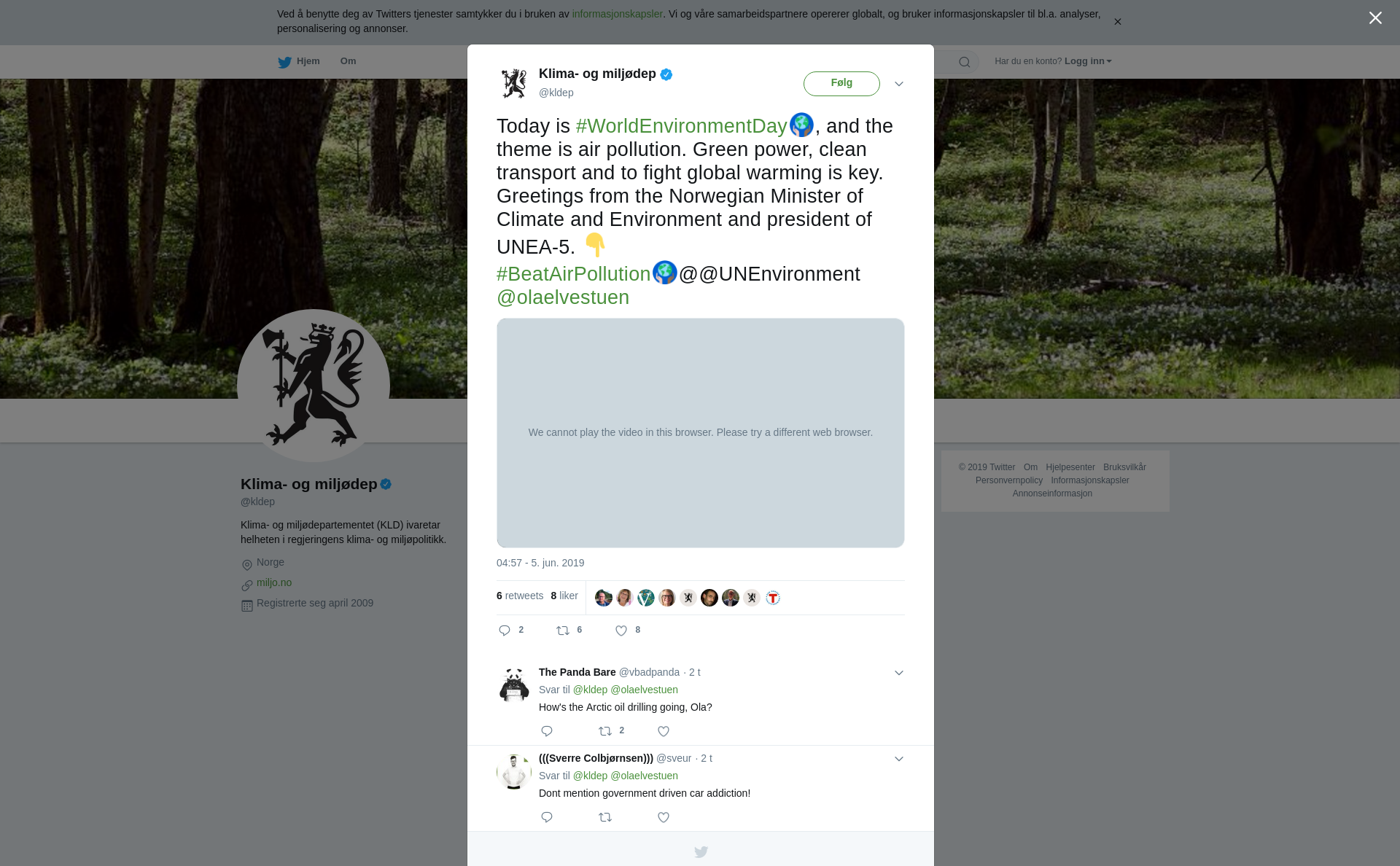 Today is #WorldEnvironmentDay, and the theme is air pollution. Green power, clean transport and to fight global warming is key. Greetings from the Norwegian Minister of Climate and Environment and president of UNEA-5. 👇