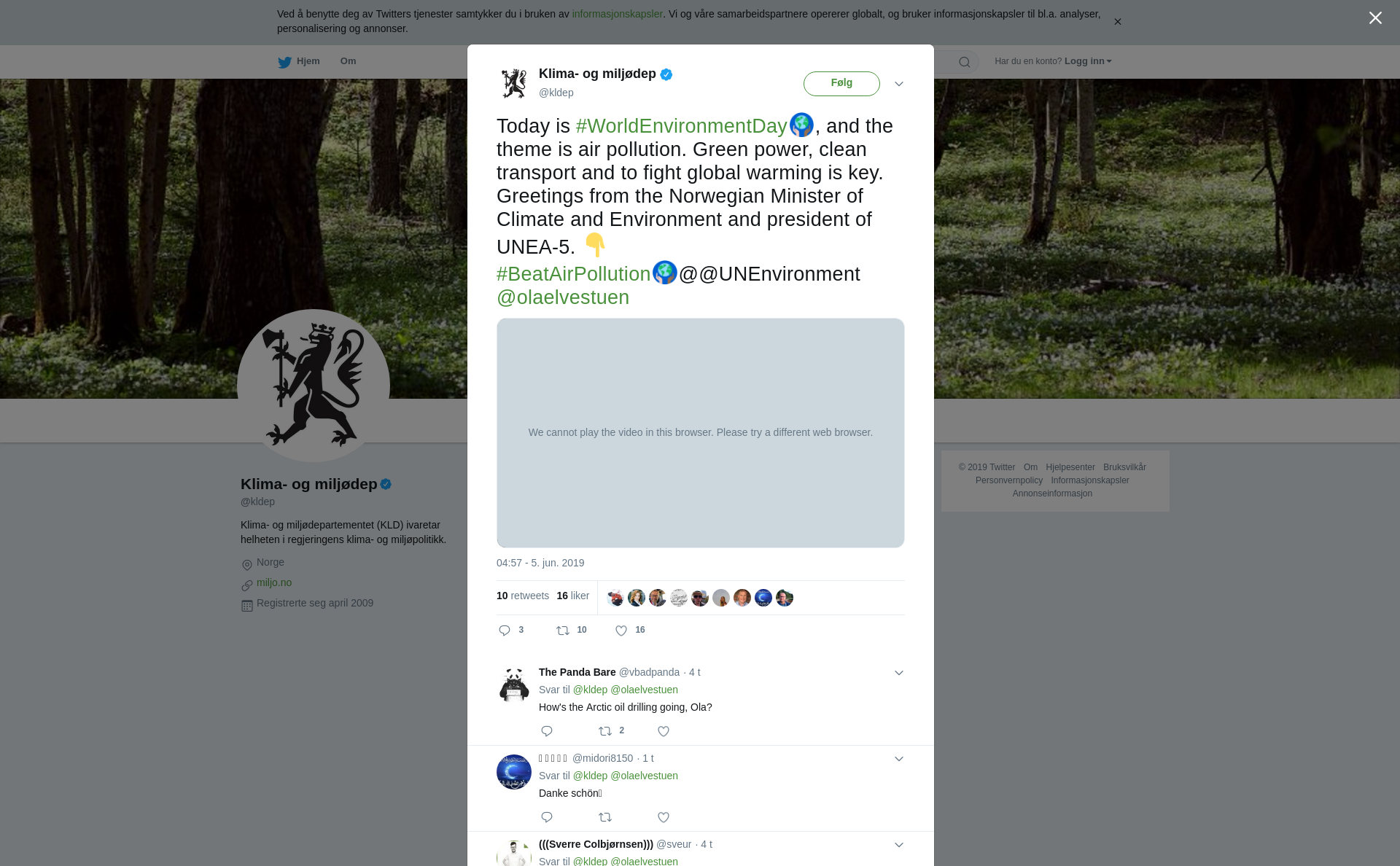 RT @kldep: Today is #WorldEnvironmentDay, and the theme is air pollution. Green power, clean transport and to fight global warming is key. Greetings from the Norwegian Minister of Climate and Environment and president of UNEA-5. 👇