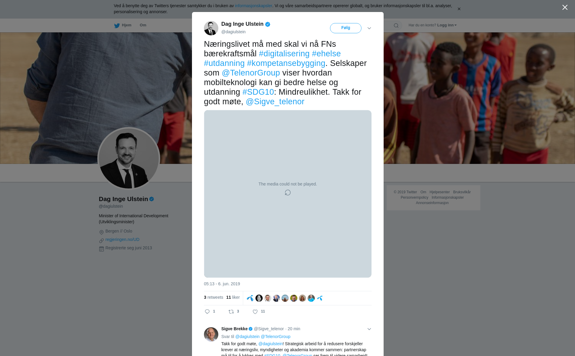 Næringslivet må med skal vi nå FNs bærekraftsmål #digitalisering #ehelse #utdanning #kompetansebygging. Selskaper som @TelenorGroup viser hvordan mobilteknologi kan gi bedre helse og utdanning #SDG10: Mindreulikhet. Takk for godt møte, @Sigve_telenor https://t.co/5MSzi6SC8k