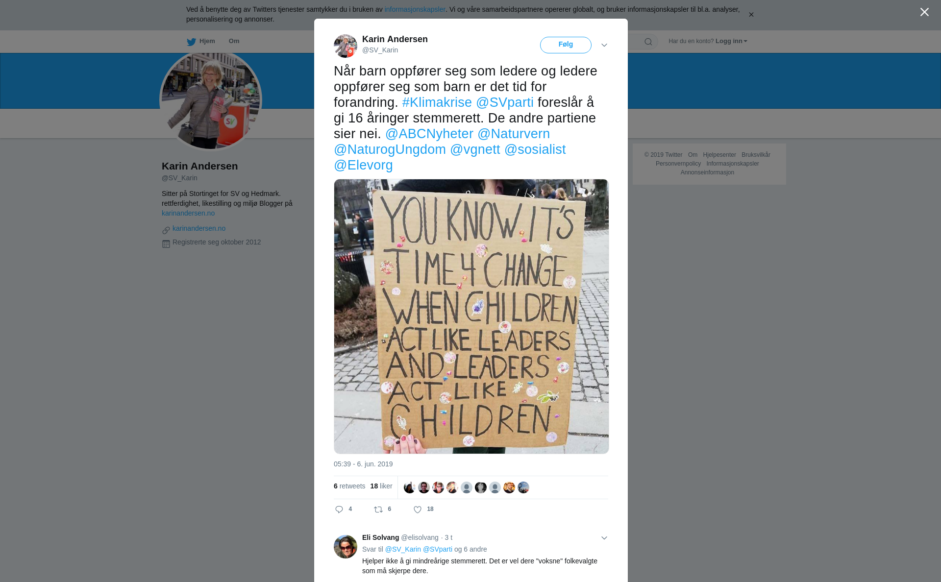 RT @SV_Karin: Når barn oppfører seg som ledere og ledere oppfører seg som barn er det tid for forandring. #Klimakrise @SVparti foreslår å gi 16 åringer stemmerett. De andre partiene sier nei. @ABCNyheter @Naturvern @NaturogUngdom @vgnett @sosialist @Elevorg https://t.co/ZKSbTPcRBl
