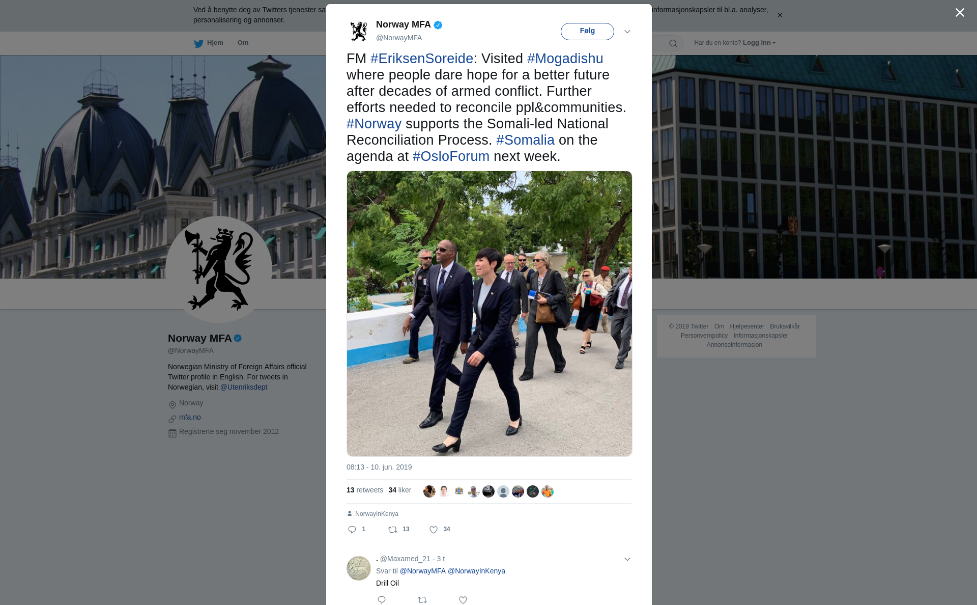 FM #EriksenSoreide: Visited #Mogadishu where people dare hope for a better future after decades of armed conflict. Further efforts needed to reconcile ppl&communities. #Norway supports the Somali-led National Reconciliation Process. #Somalia on the agenda at #OsloForum next week. https://t.co/6k3vOUH0JG
