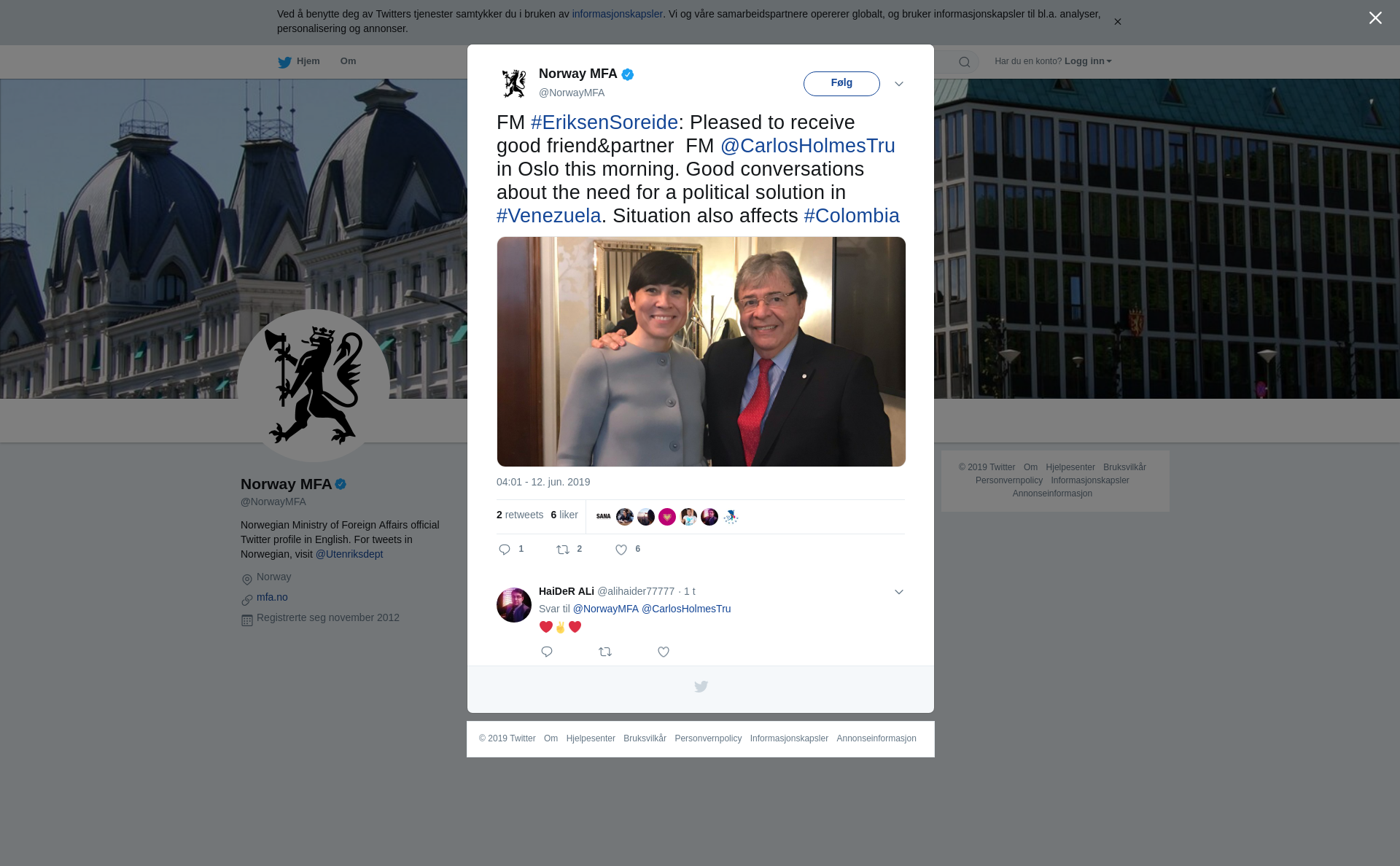 FM #EriksenSoreide: Pleased to receive good friend&partner  FM @CarlosHolmesTru in Oslo this morning. Good conversations about the need for a political solution in #Venezuela. Situation also affects #Colombia https://t.co/tkUqt4mQDQ