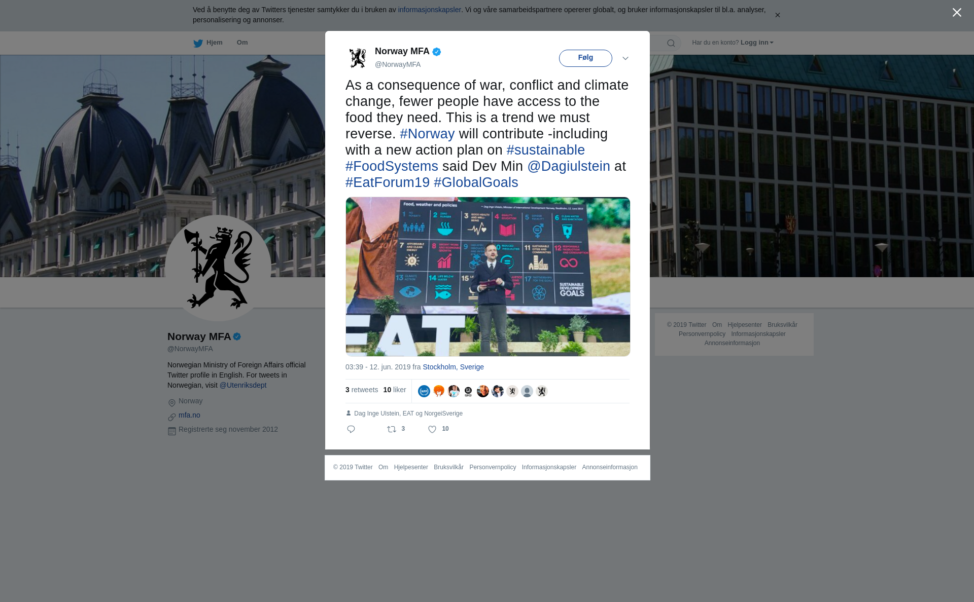 As a consequence of war, conflict and climate change, fewer people have access to the food they need. This is a trend we must reverse. #Norway will contribute -including with a new action plan on #sustainable #FoodSystems said Dev Min @Dagiulstein at #EatForum19 #GlobalGoals https://t.co/yER4ZkM48u
