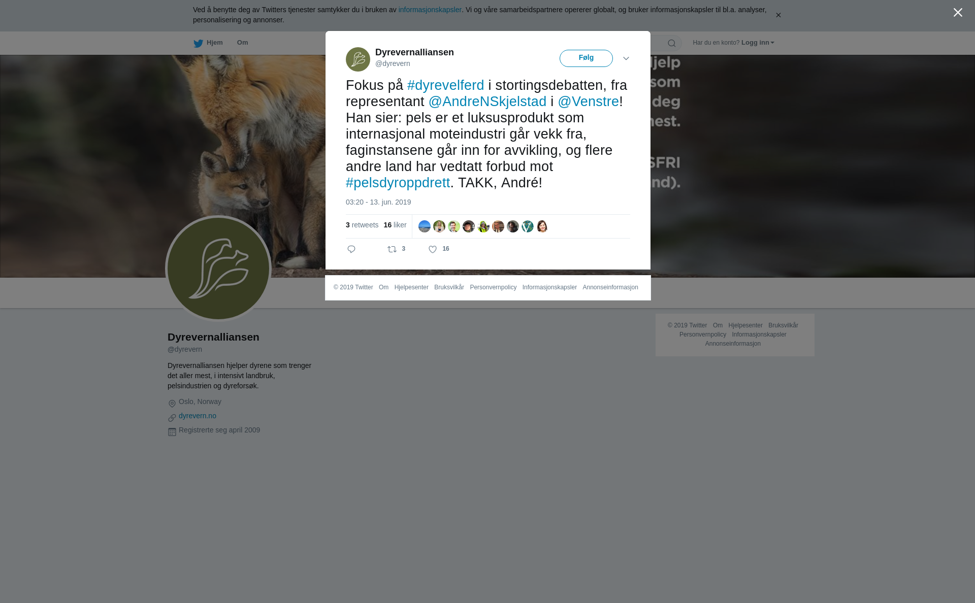 RT @dyrevern: Fokus på #dyrevelferd i stortingsdebatten, fra representant @AndreNSkjelstad i @Venstre! Han sier: pels er et luksusprodukt som internasjonal moteindustri går vekk fra, faginstansene går inn for avvikling, og flere andre land har vedtatt forbud mot #pelsdyroppdrett. TAKK, André!