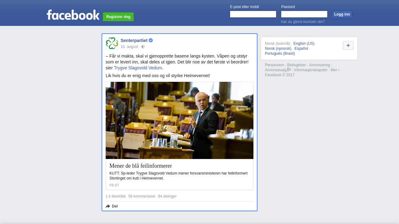 – Får vi makta, skal vi gjenopprette basene langs kysten. Våpen og utstyr som er levert inn, skal deles ut igjen. Det blir noe av det første vi beordrer! sier Trygve Slagsvold Vedum.