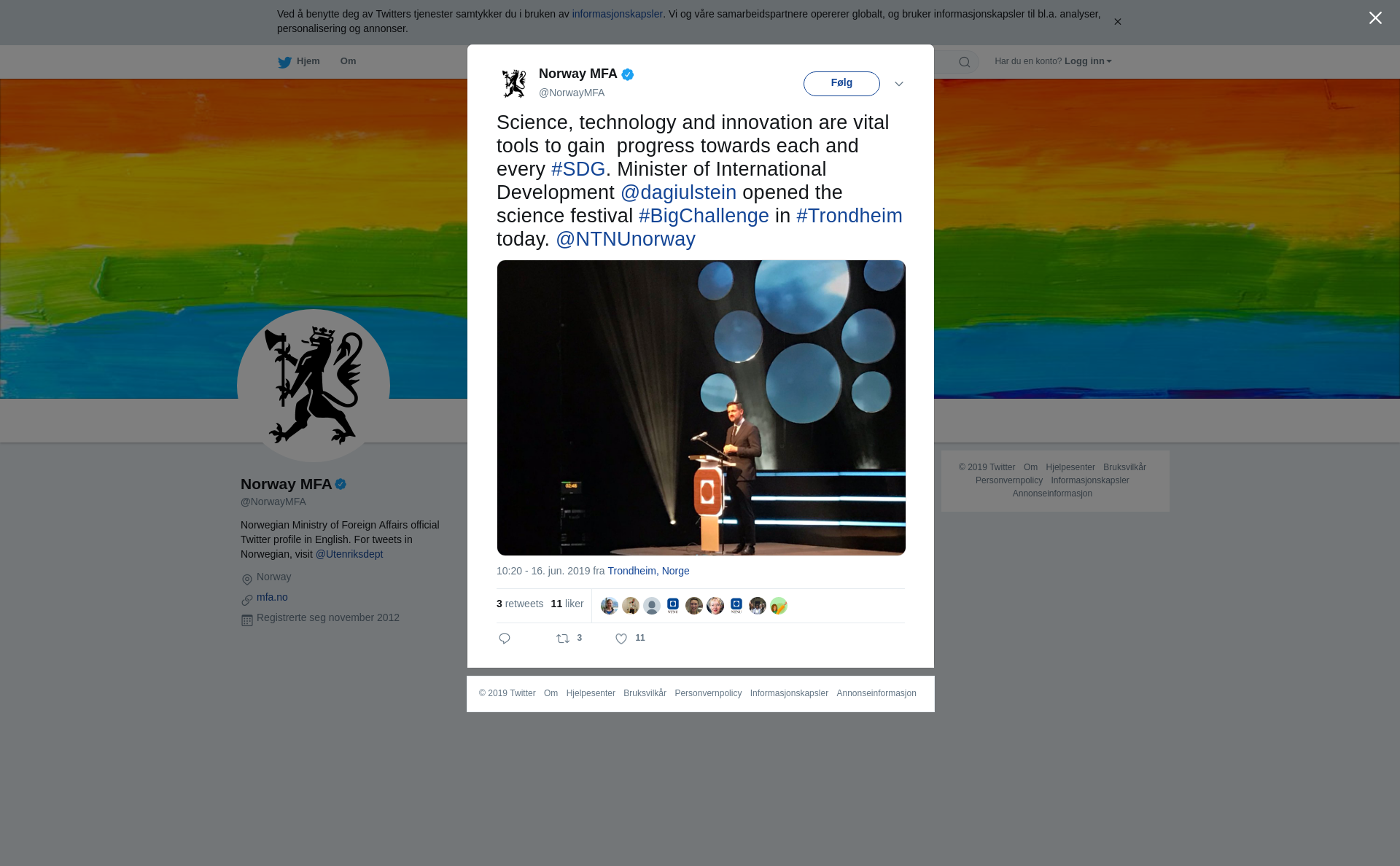 Science, technology and innovation are vital tools to gain progress towards each and every #SDG. Minister of International Development @dagiulstein opened the science festival #BigChallenge in #Trondheim today. @NTNUnorway https://t.co/dNLlPKTEKg