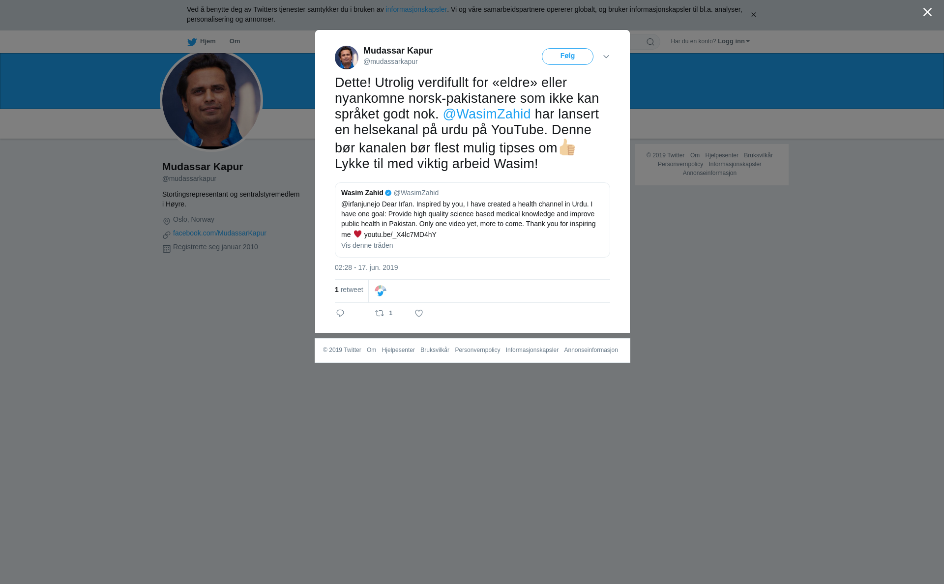 Dette! Utrolig verdifullt for «eldre» eller nyankomne norsk-pakistanere som ikke kan språket godt nok. @WasimZahid har lansert en helsekanal på urdu på YouTube. Denne bør kanalen bør flest mulig tipses om👍🏼 Lykke til med viktig arbeid Wasim!