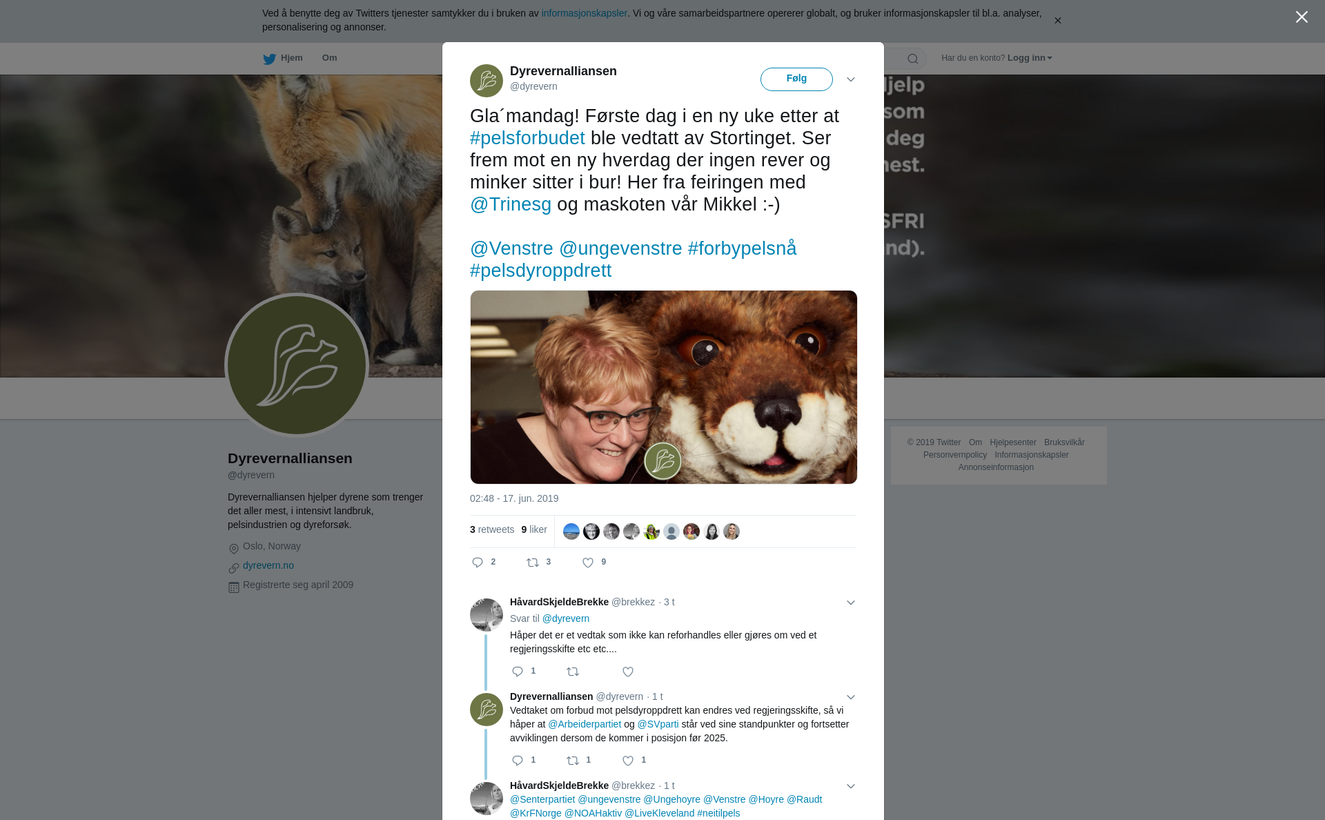 RT @dyrevern: Gla´mandag! Første dag i en ny uke etter at #pelsforbudet ble vedtatt av Stortinget. Ser frem mot en ny hverdag der ingen rever og minker sitter i bur! Her fra feiringen med @Trinesg og maskoten vår Mikkel :-)