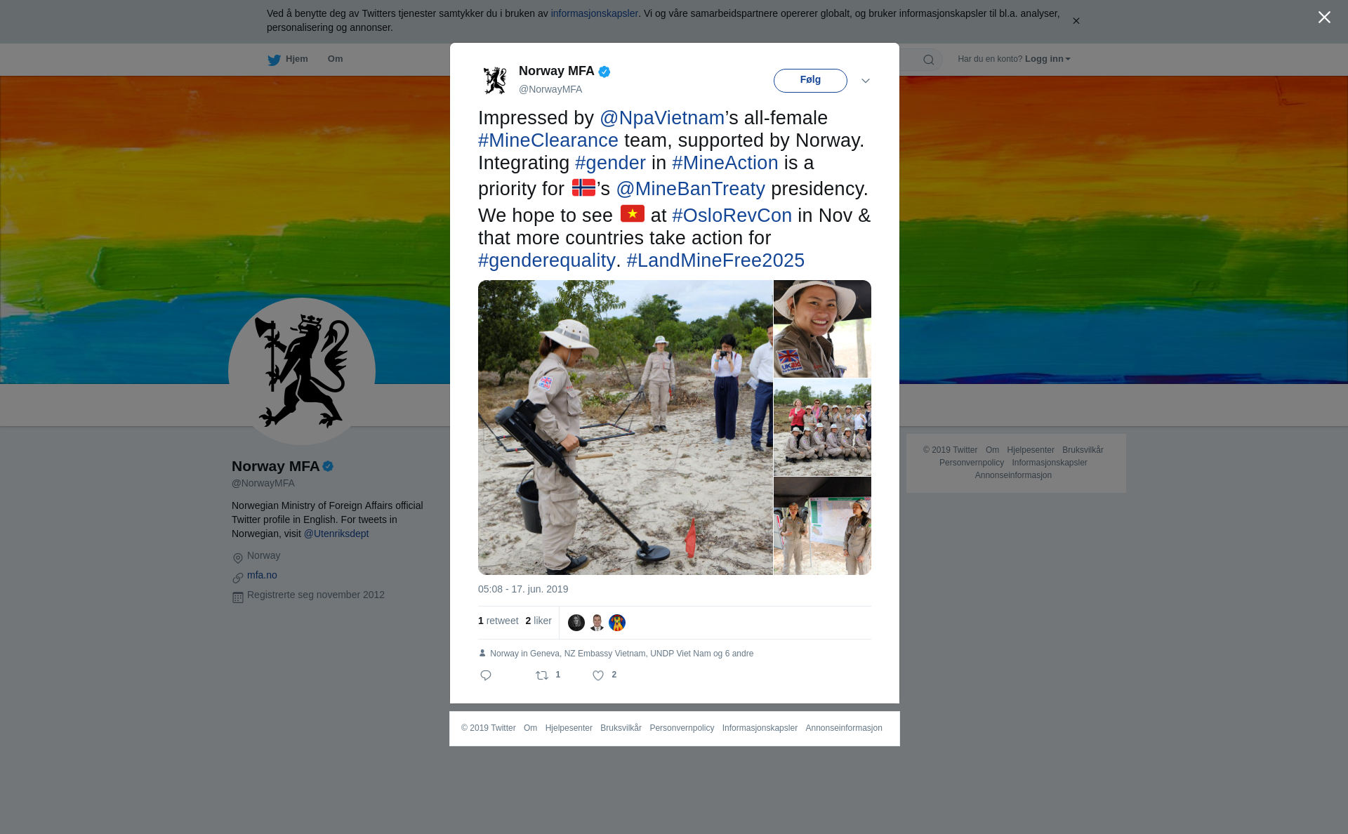 Impressed by @NpaVietnam’s all-female #MineClearance team, supported by Norway. Integrating #gender in #MineAction is a priority for 🇳🇴’s @MineBanTreaty presidency. We hope to see 🇻🇳 at #OsloRevCon in Nov & that more countries take action for #genderequality. #LandMineFree2025 https://t.co/feKQ5TbDVN