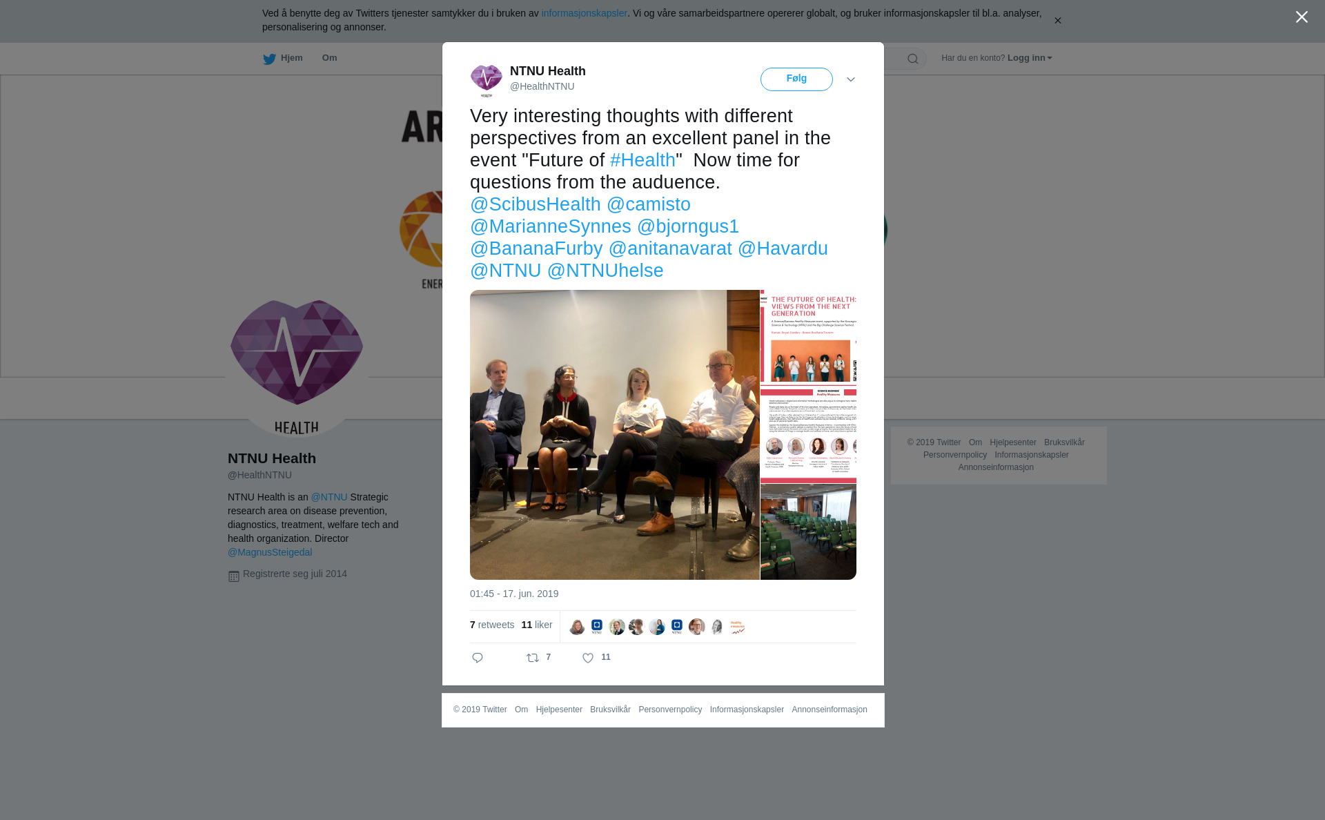 RT @HealthNTNU: Very interesting thoughts with different perspectives from an excellent panel in the event "Future of #Health" https://t.co/1TOG5hJgtl Now time for questions from the auduence. @ScibusHealth @camisto @MarianneSynnes @bjorngus1 @BananaFurby @anitanavarat @Havardu @NTNU @NTNUhelse https://t.co/0wljcHd74j