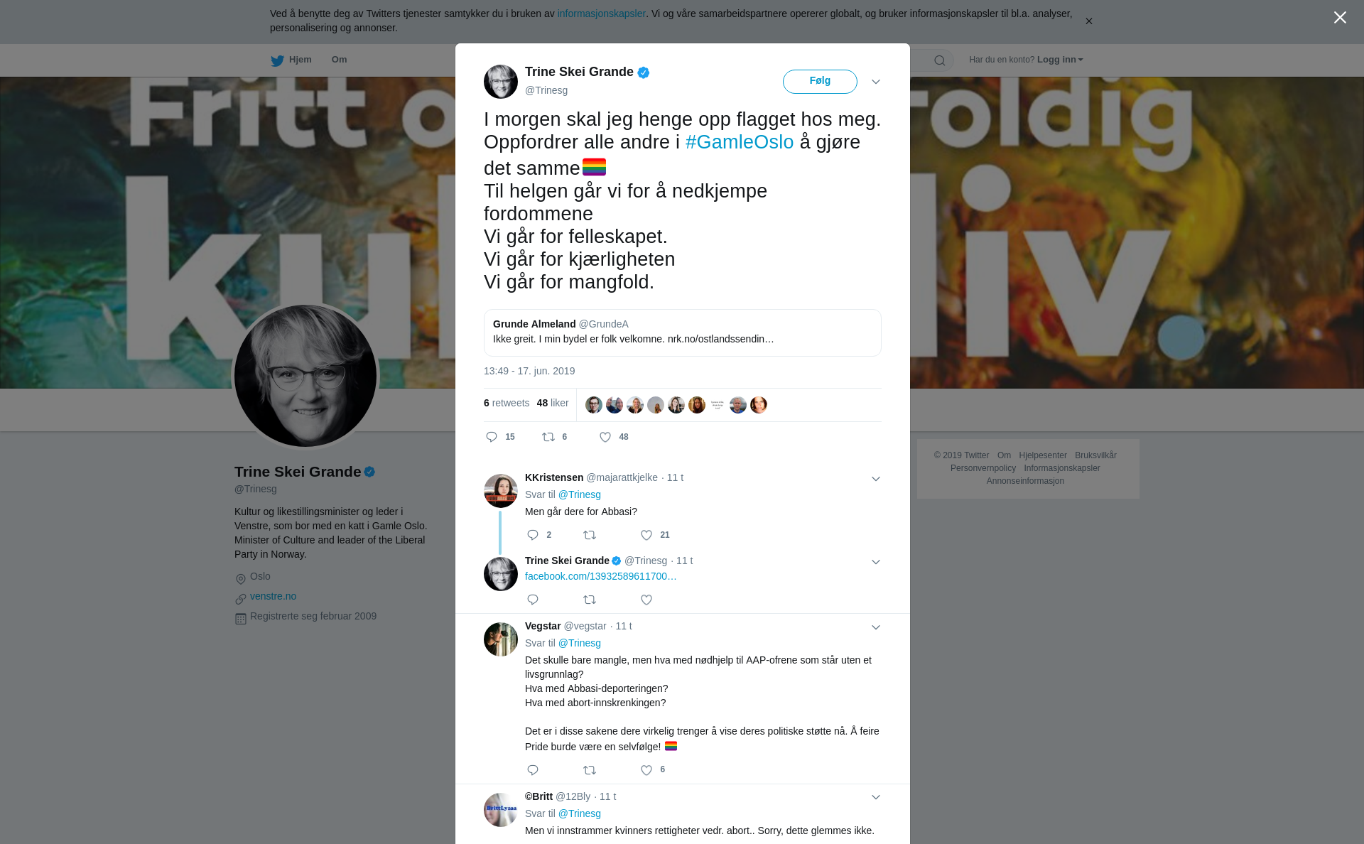 I morgen skal jeg henge opp flagget hos meg. Oppfordrer alle andre i #GamleOslo å gjøre det samme🏳️🌈 Til helgen går vi for å nedkjempe fordommene Vi går for felleskapet. Vi går for kjærligheten Vi går for mangfold.