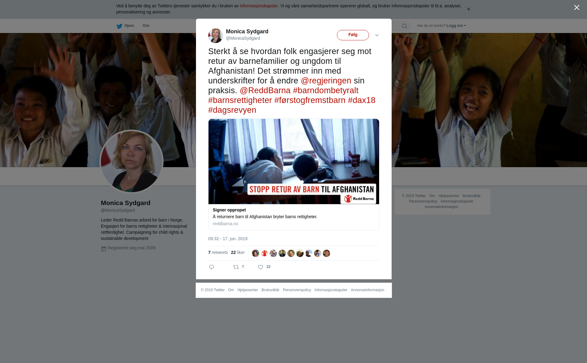 RT @MonicaSydgard: Sterkt å se hvordan folk engasjerer seg mot retur av barnefamilier og ungdom til Afghanistan! Det strømmer inn med underskrifter for å endre @regjeringen sin praksis. @ReddBarna #barndombetyralt #barnsrettigheter #førstogfremstbarn #dax18 #dagsrevyen https://t.co/pIZBtciZ19
