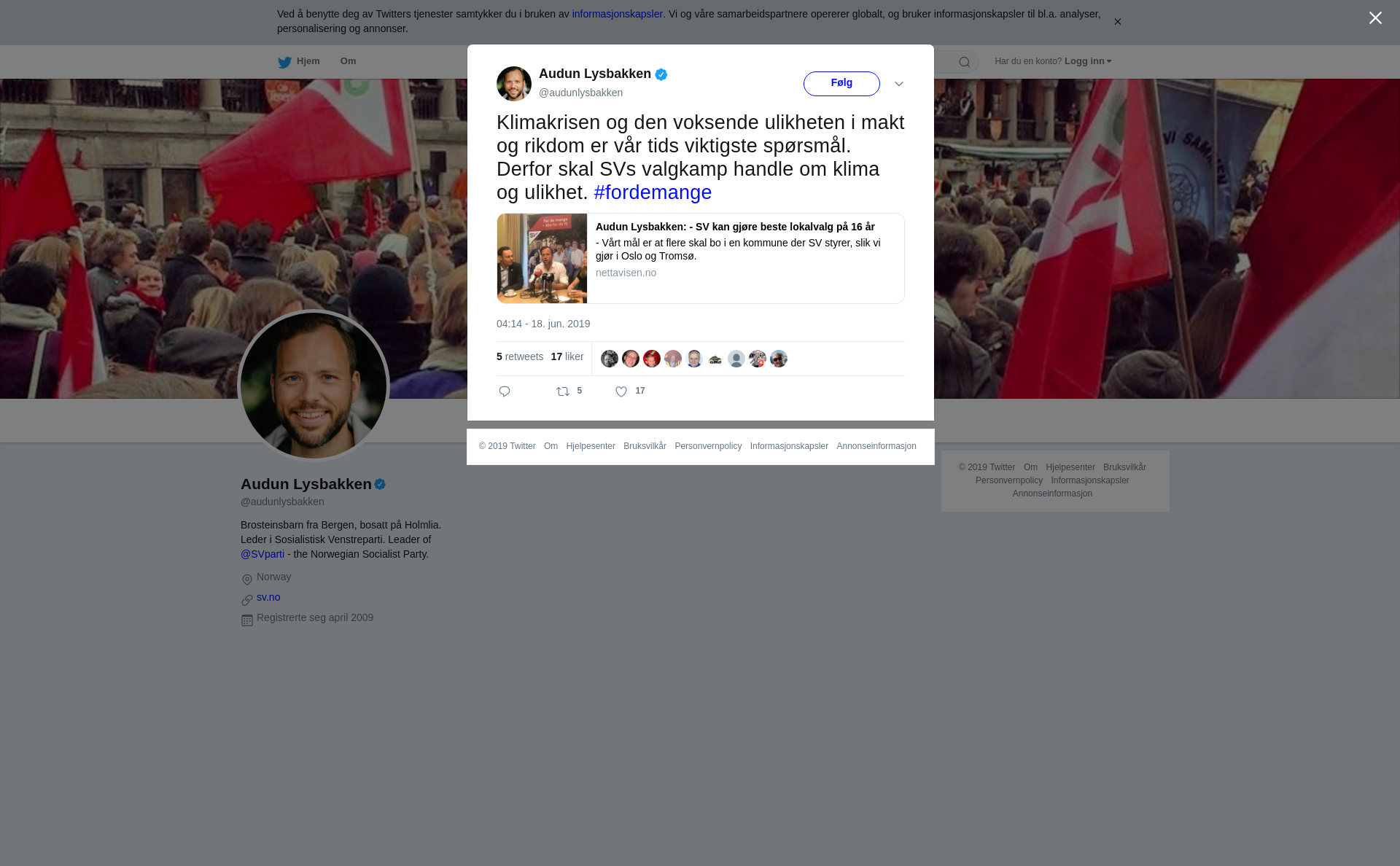 RT @audunlysbakken: Klimakrisen og den voksende ulikheten i makt og rikdom er vår tids viktigste spørsmål. Derfor skal SVs valgkamp handle om klima og ulikhet. #fordemange https://t.co/QeRpHjq1CF