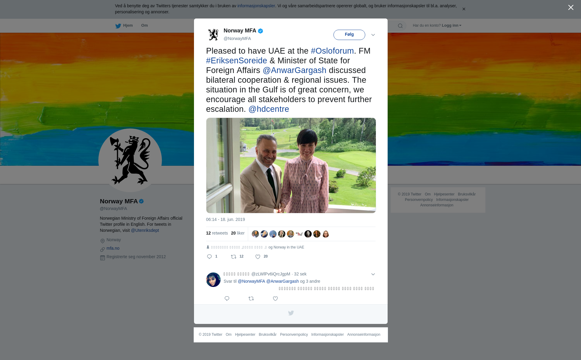 Pleased to have UAE at the #Osloforum. FM #EriksenSoreide & Minister of State for Foreign Affairs @AnwarGargash discussed bilateral cooperation & regional issues. The situation in the Gulf is of great concern, we encourage all stakeholders to prevent further escalation. @hdcentre https://t.co/MbqkLlOMSO